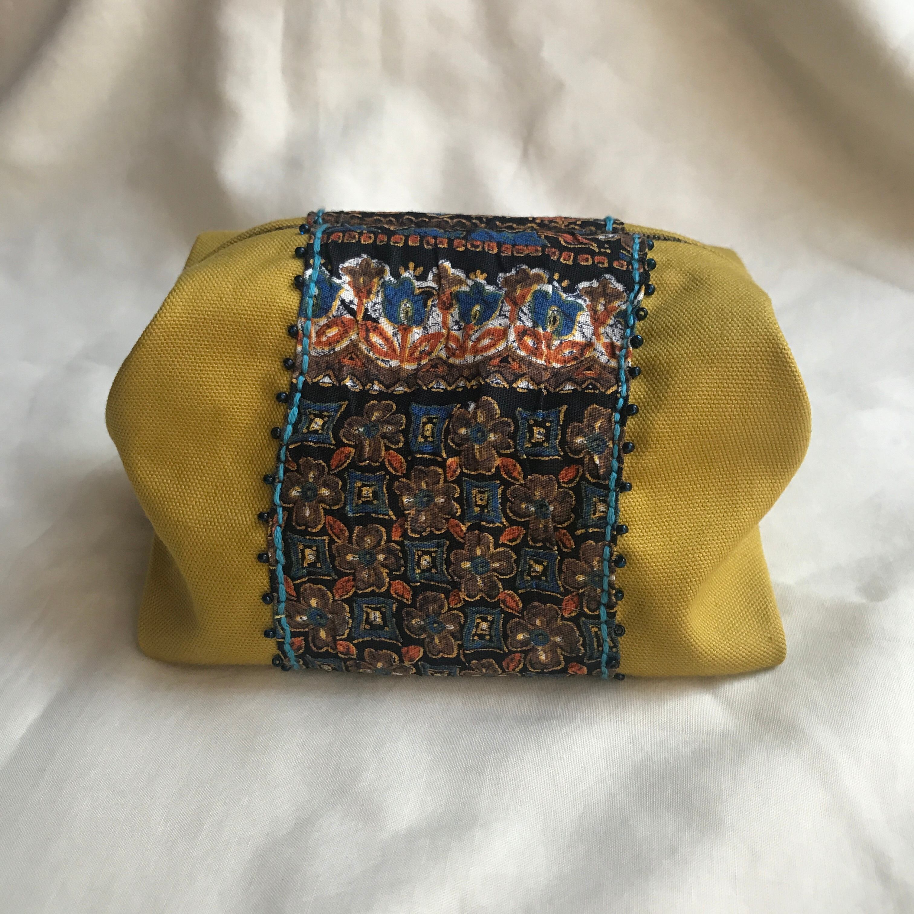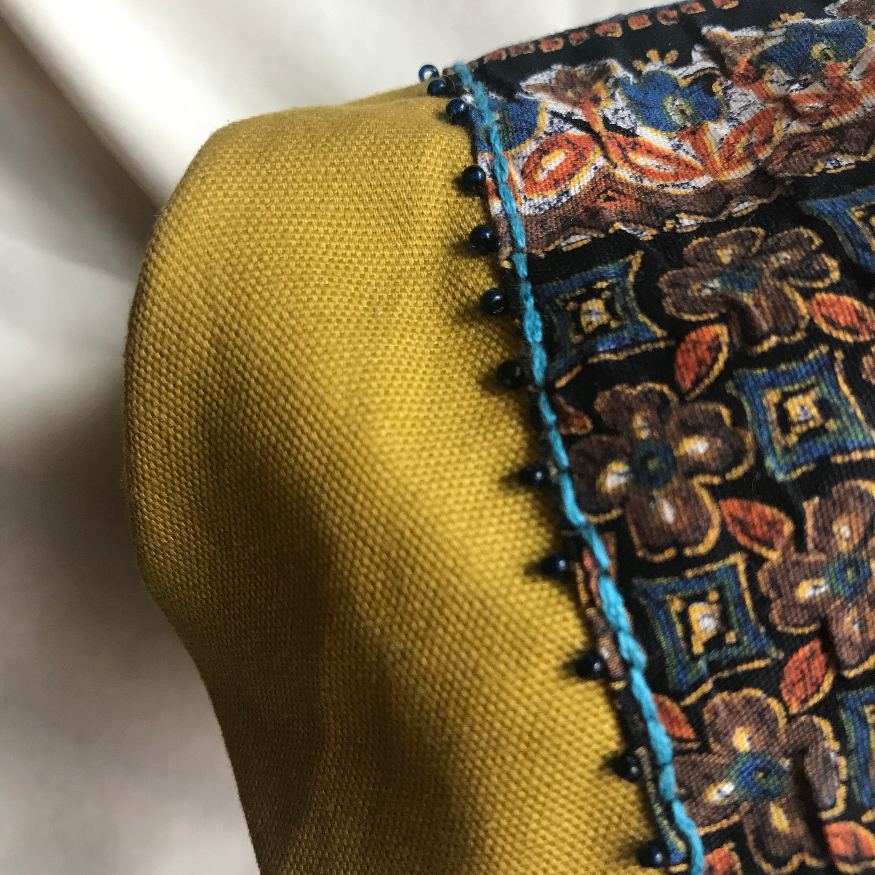 マスタードカラーの生地に古着からカットした生地を組み合わせ、ビーズを縫い留めました。
