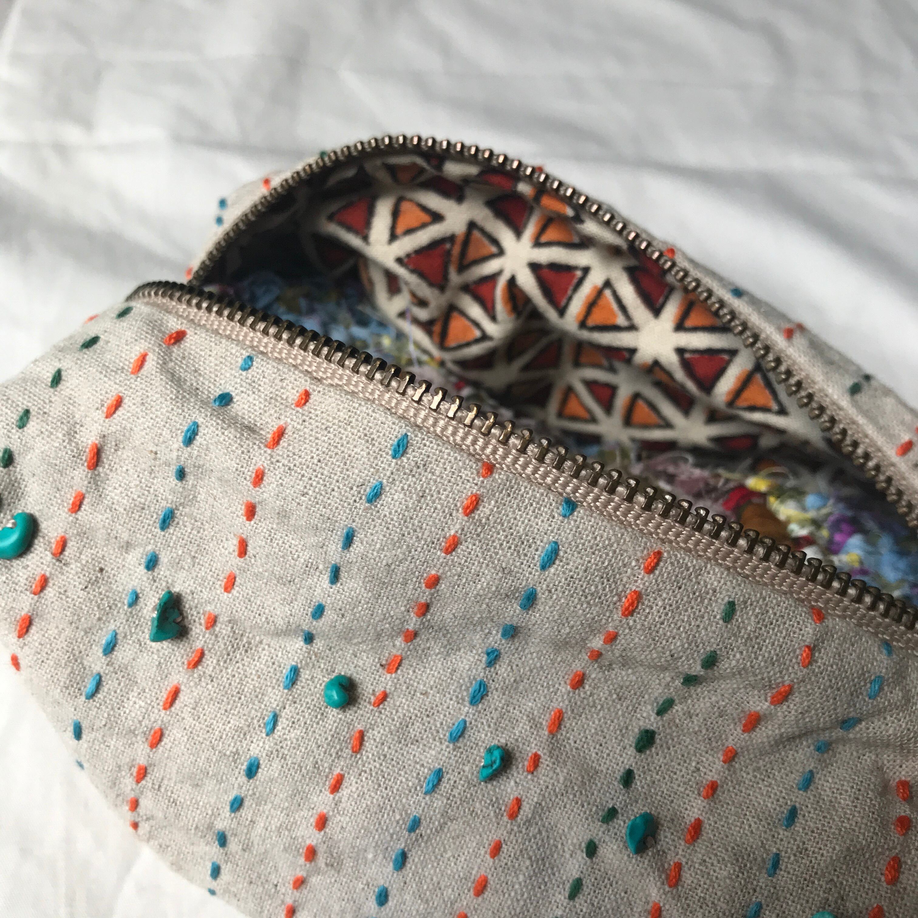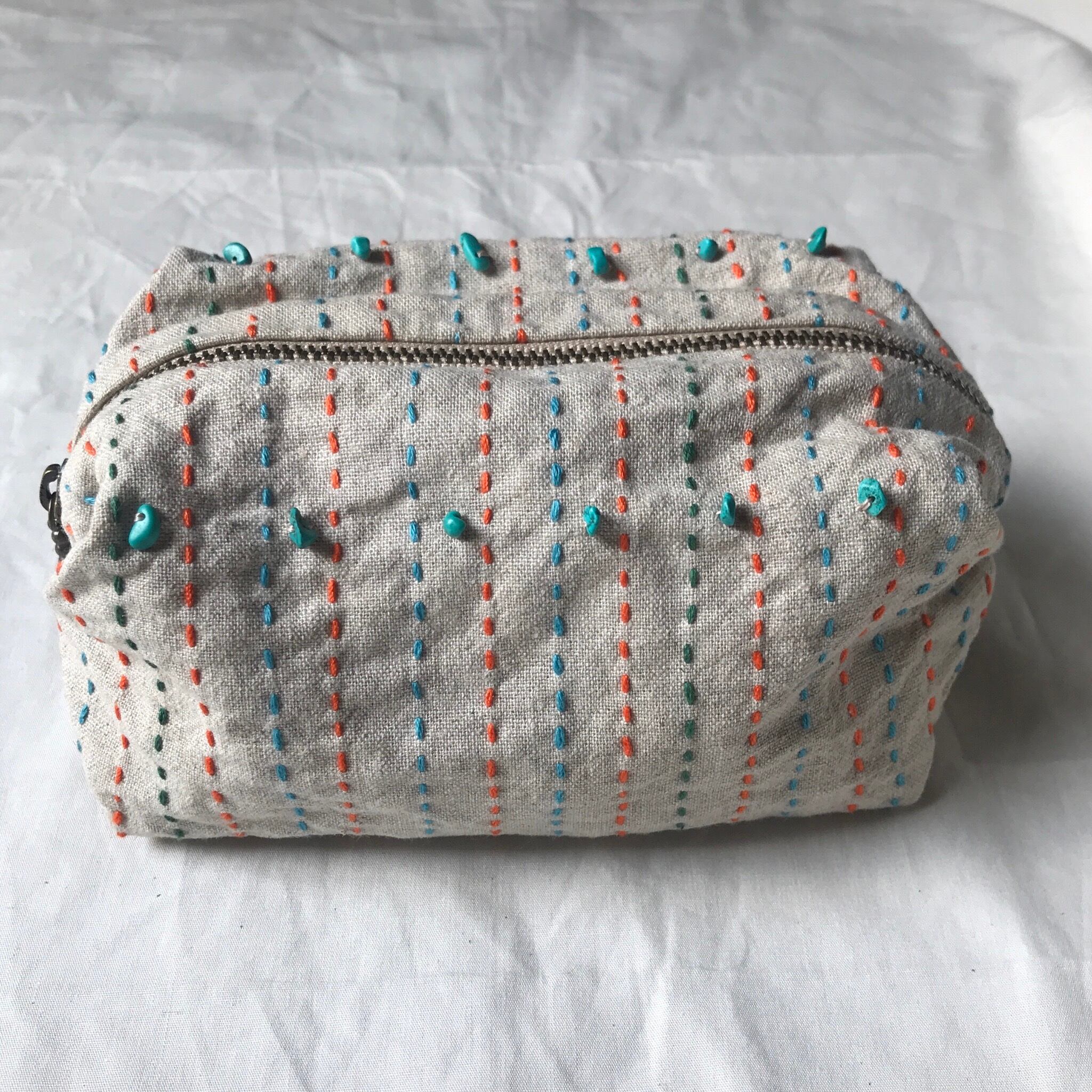 コットンリネン生地にステッチをほどこし、ターコイズの細石を縫い留めています。