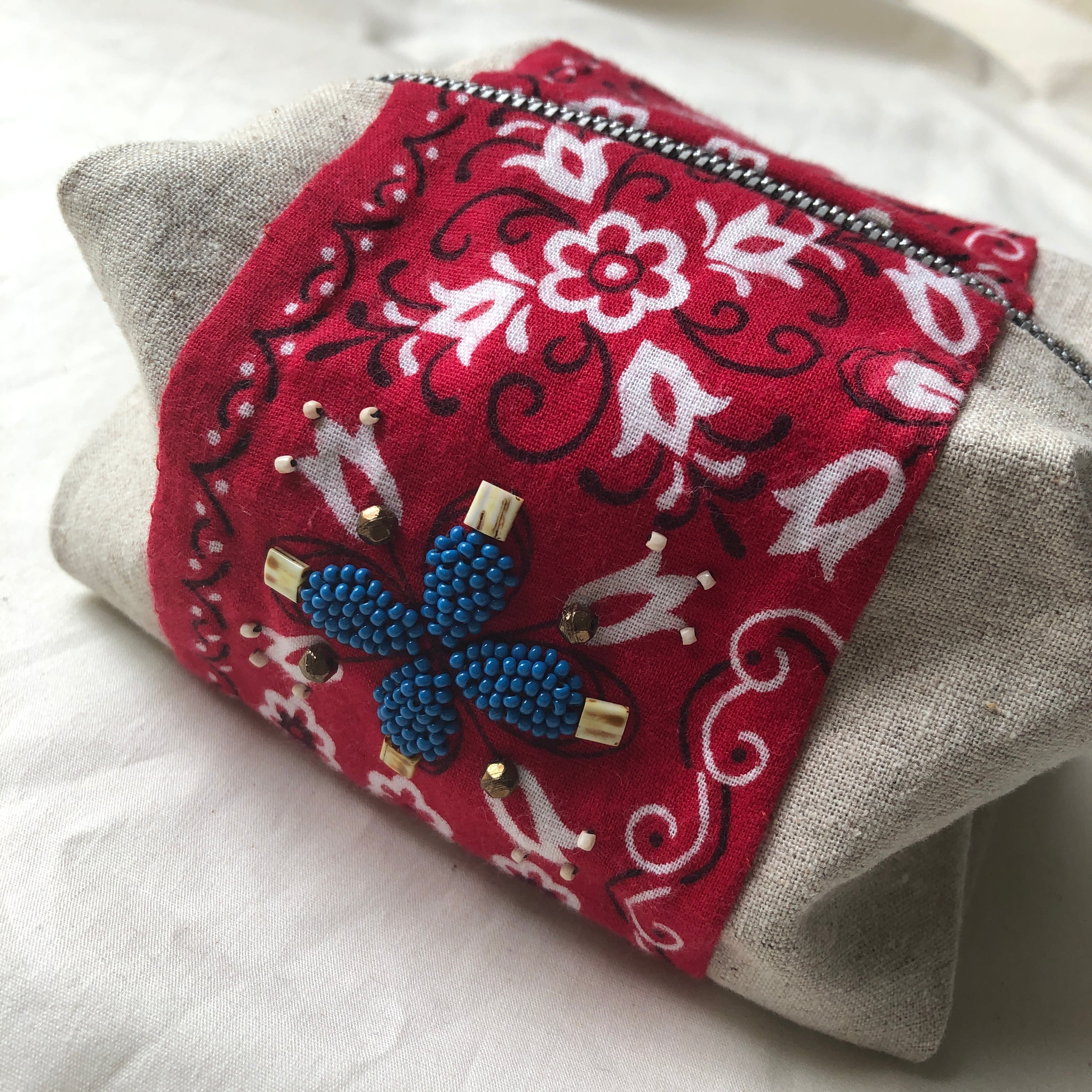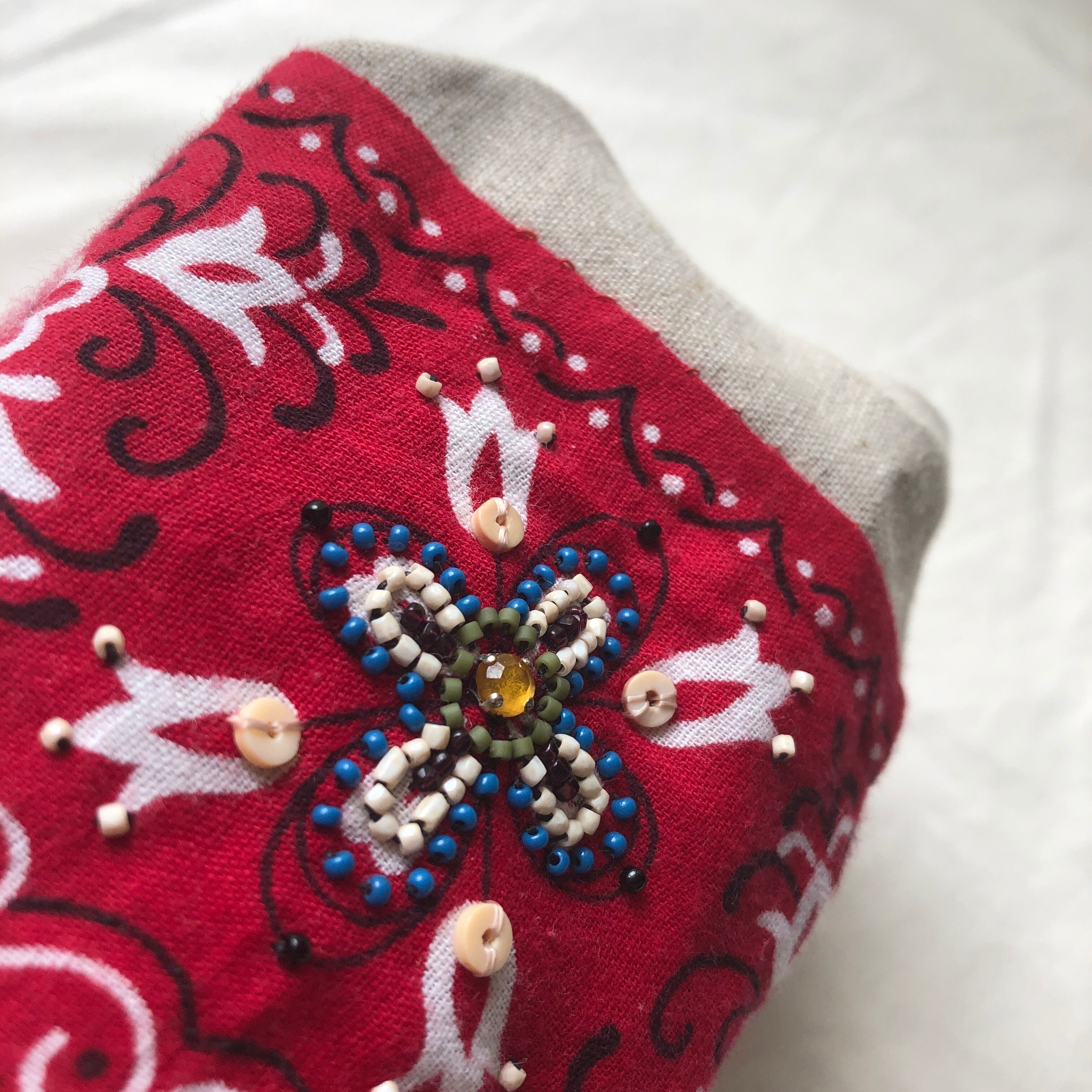 ヴィンテージのバンダナに、ビーズ刺繍をほどこしたものをキャラメルポーチに仕立てました。