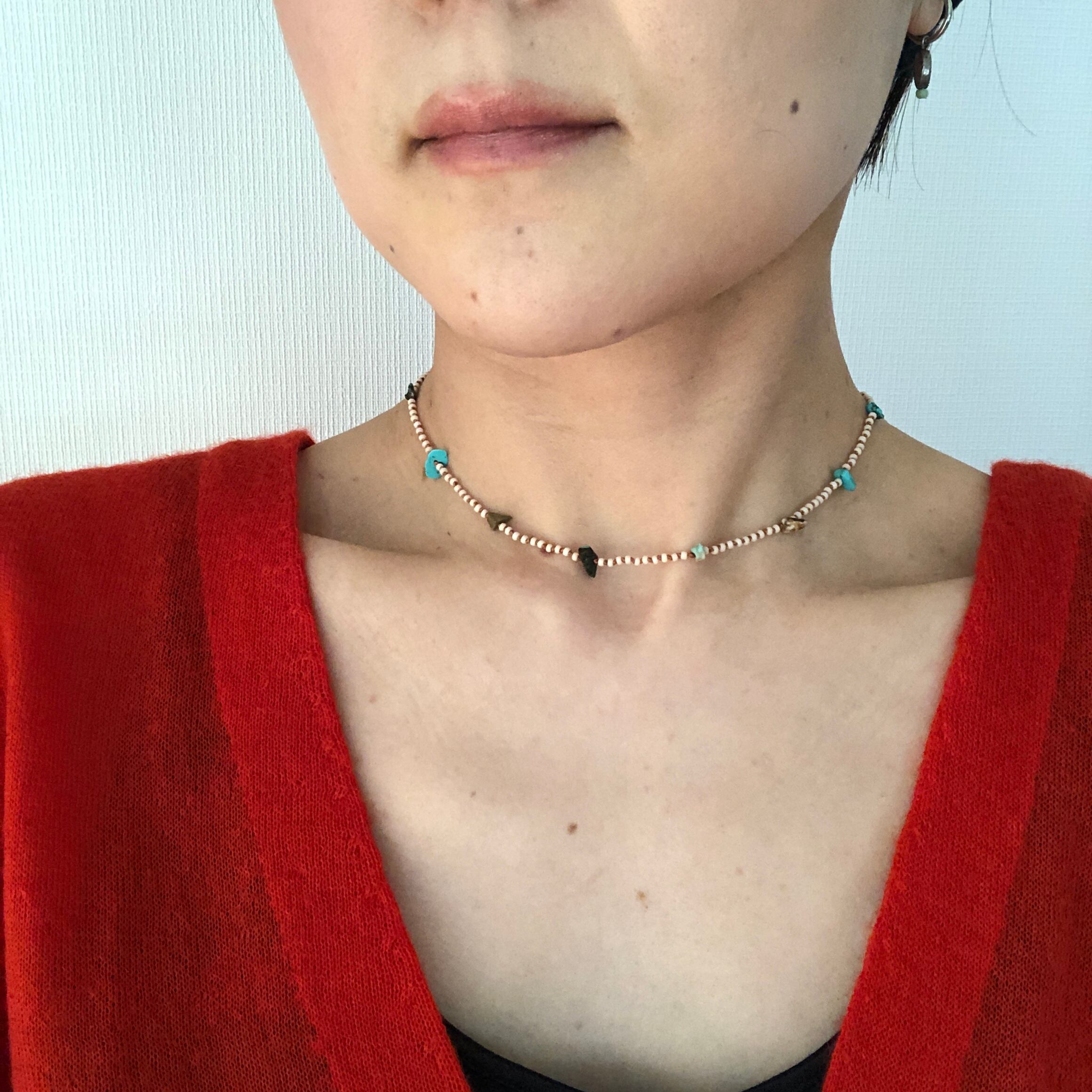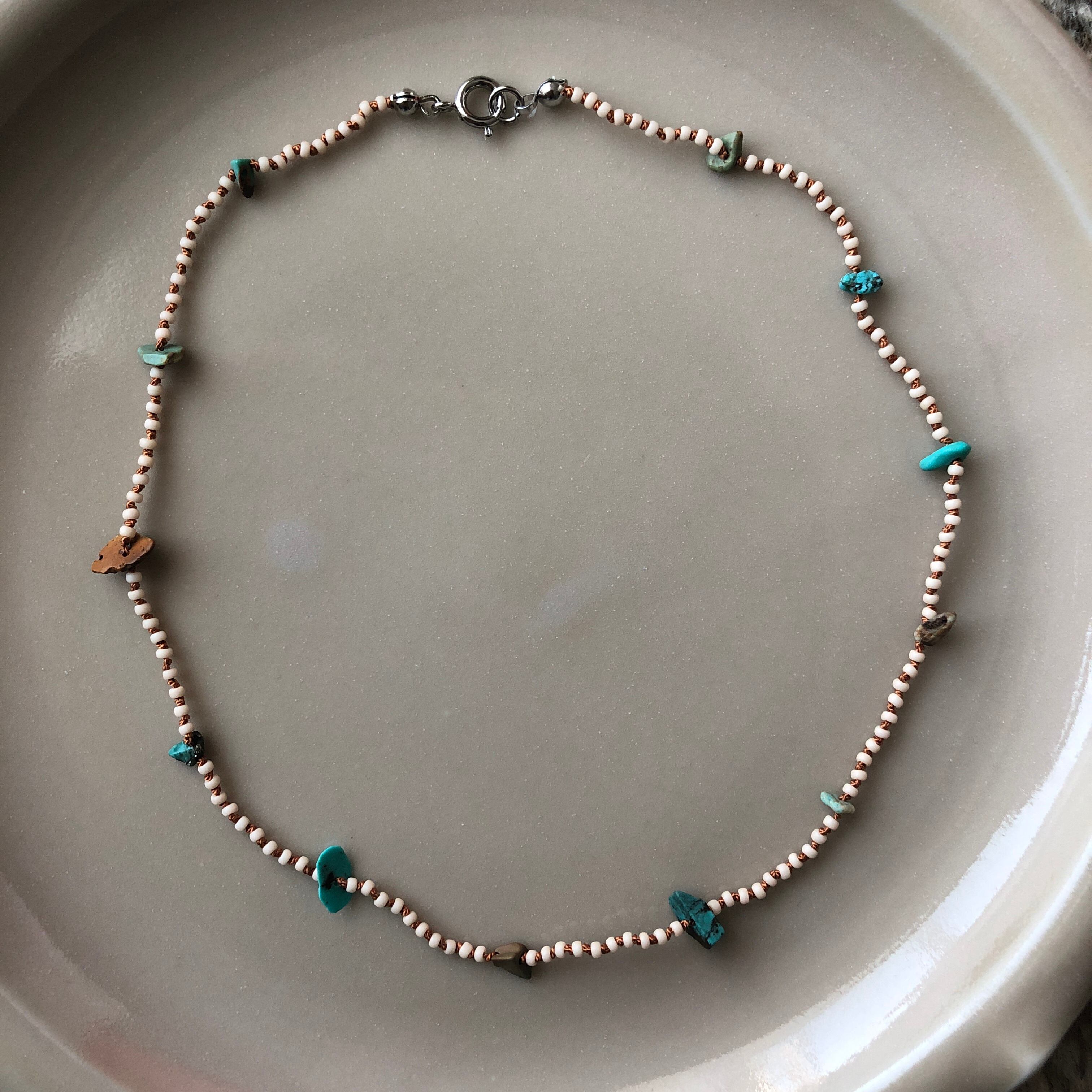 象牙色のマットなシードビーズとターコイズの細石をドイツ製のシルクコードで繋ぎました。