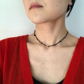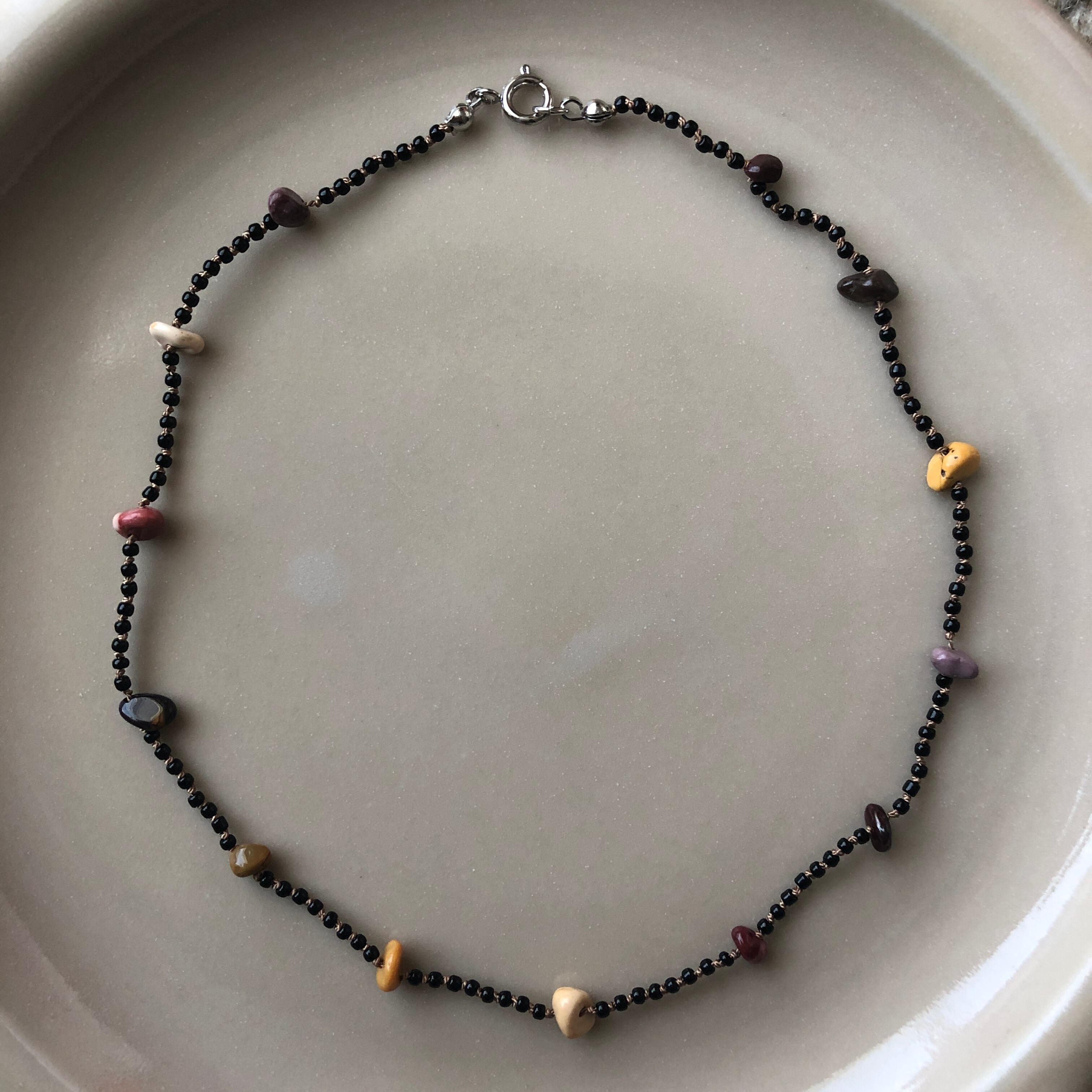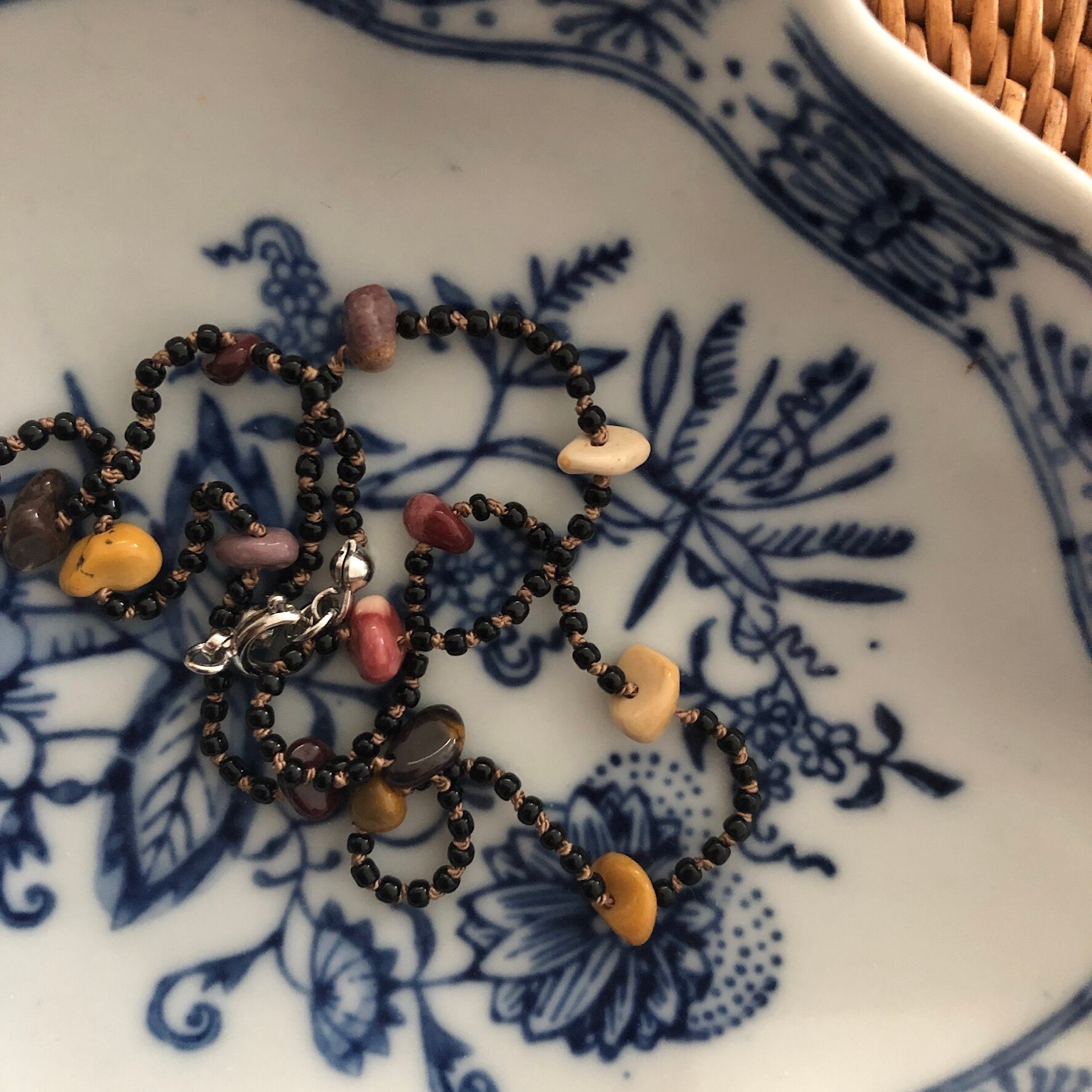 黒のシードビーズと翡翠の一種であるムーアカイトの細石をドイツ製のシルクコードで繋ぎました。