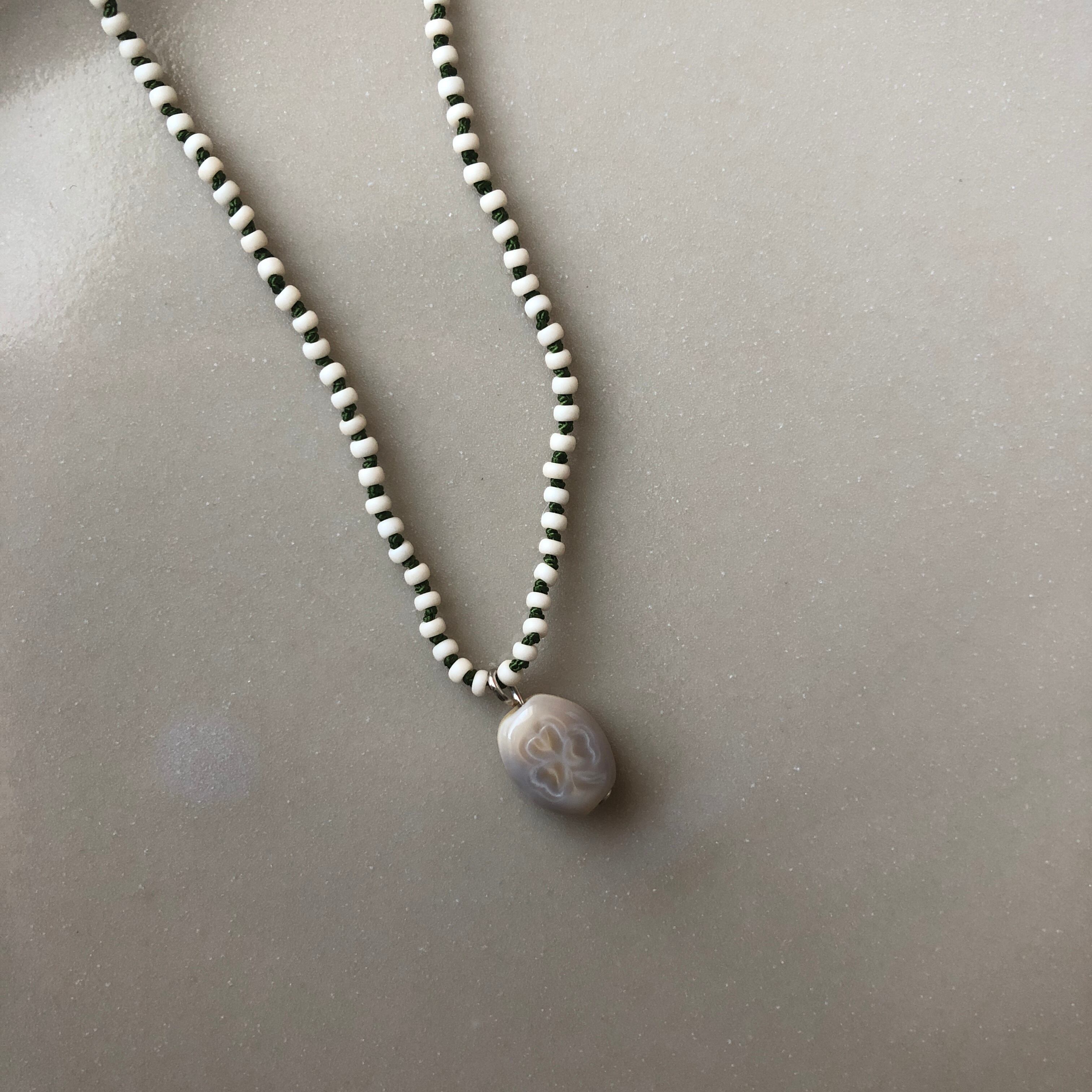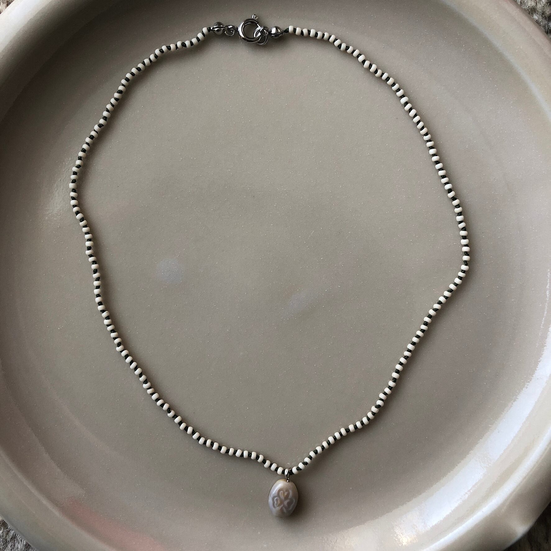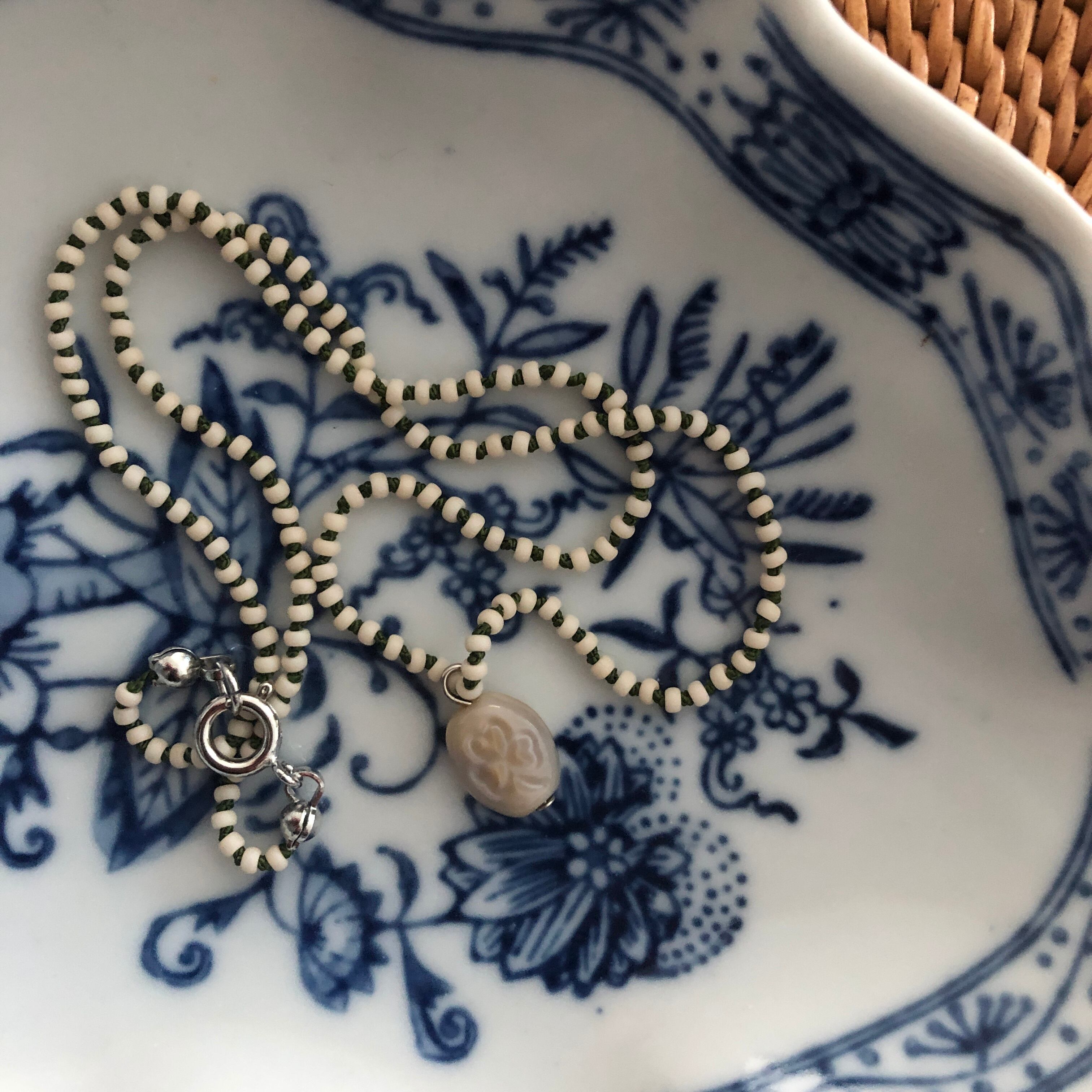 ドイツ製のシルクコードでビーズを一粒一粒結び留めたネックレスです。