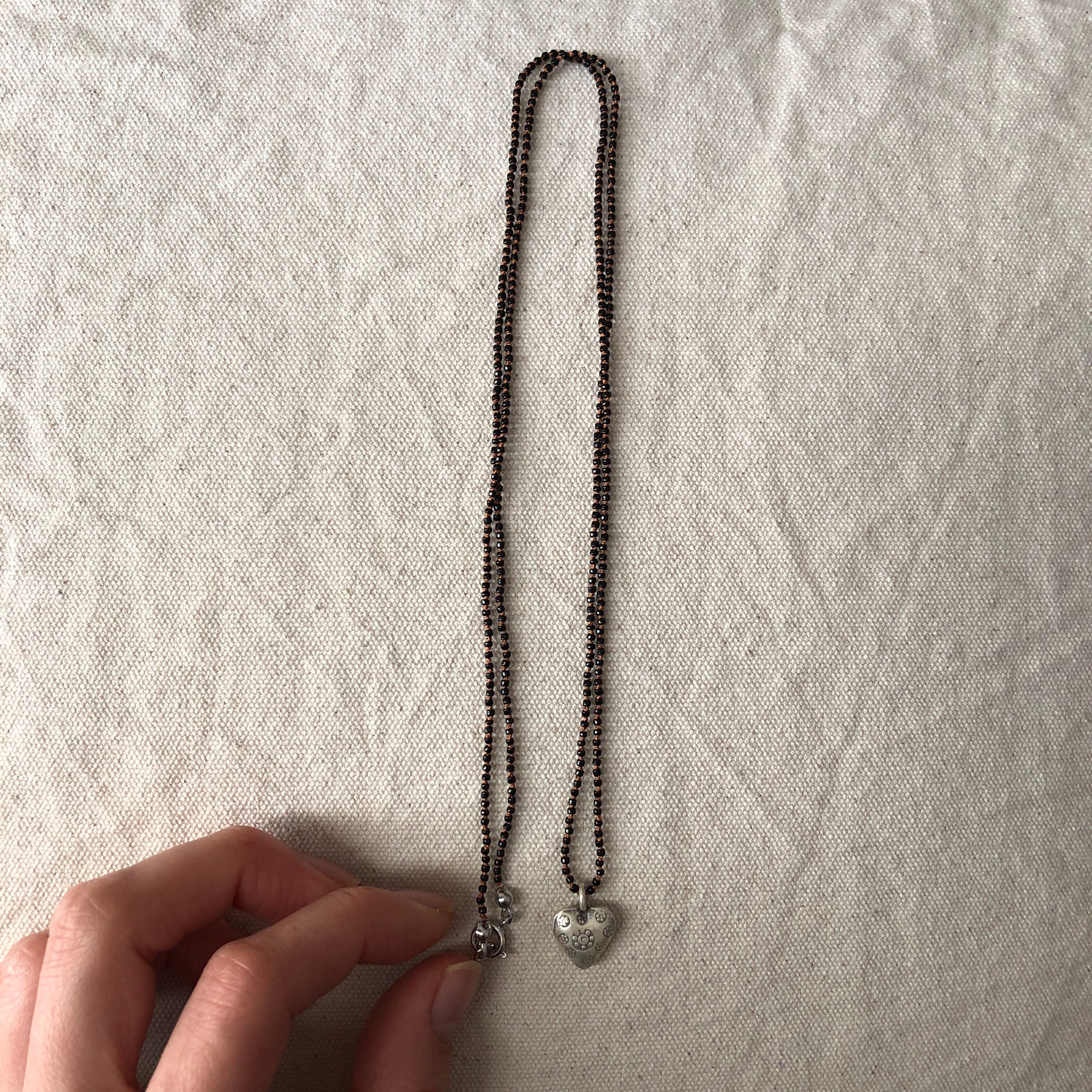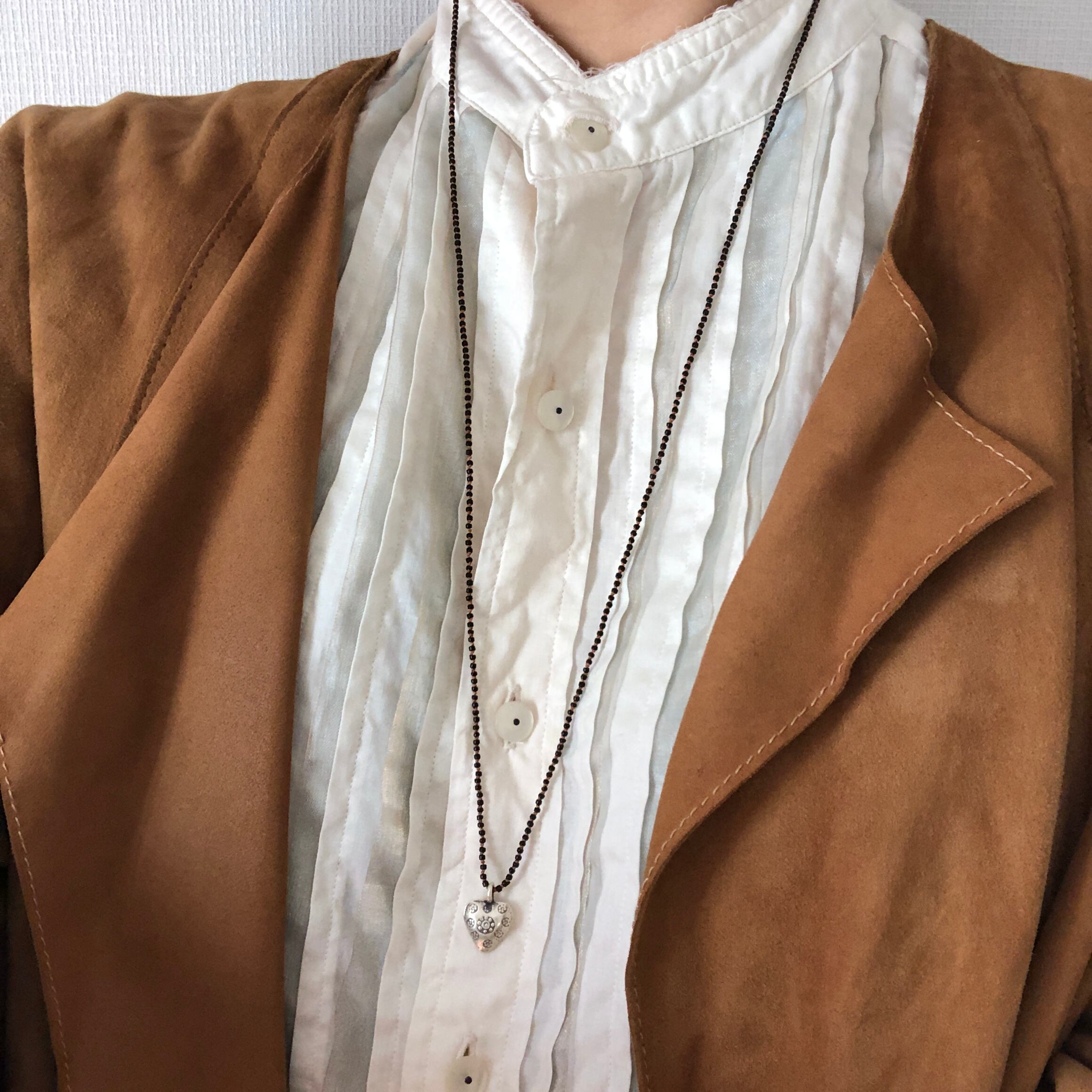 黒の極小シードビーズをドイツ製シルクコードでひと粒ひと粒結び留めたロングネックレスにカレンシルバーのハートモチーフを合わせました。