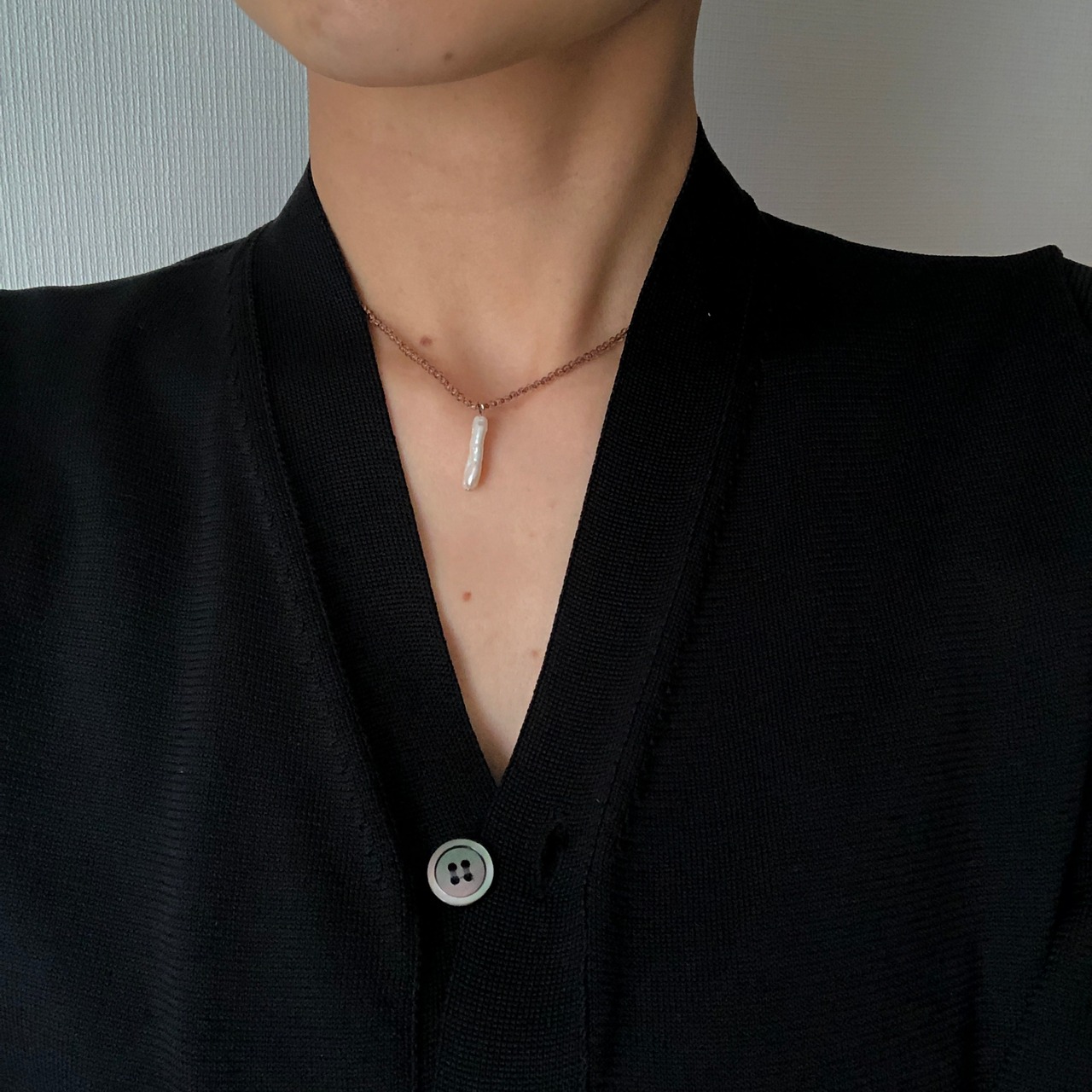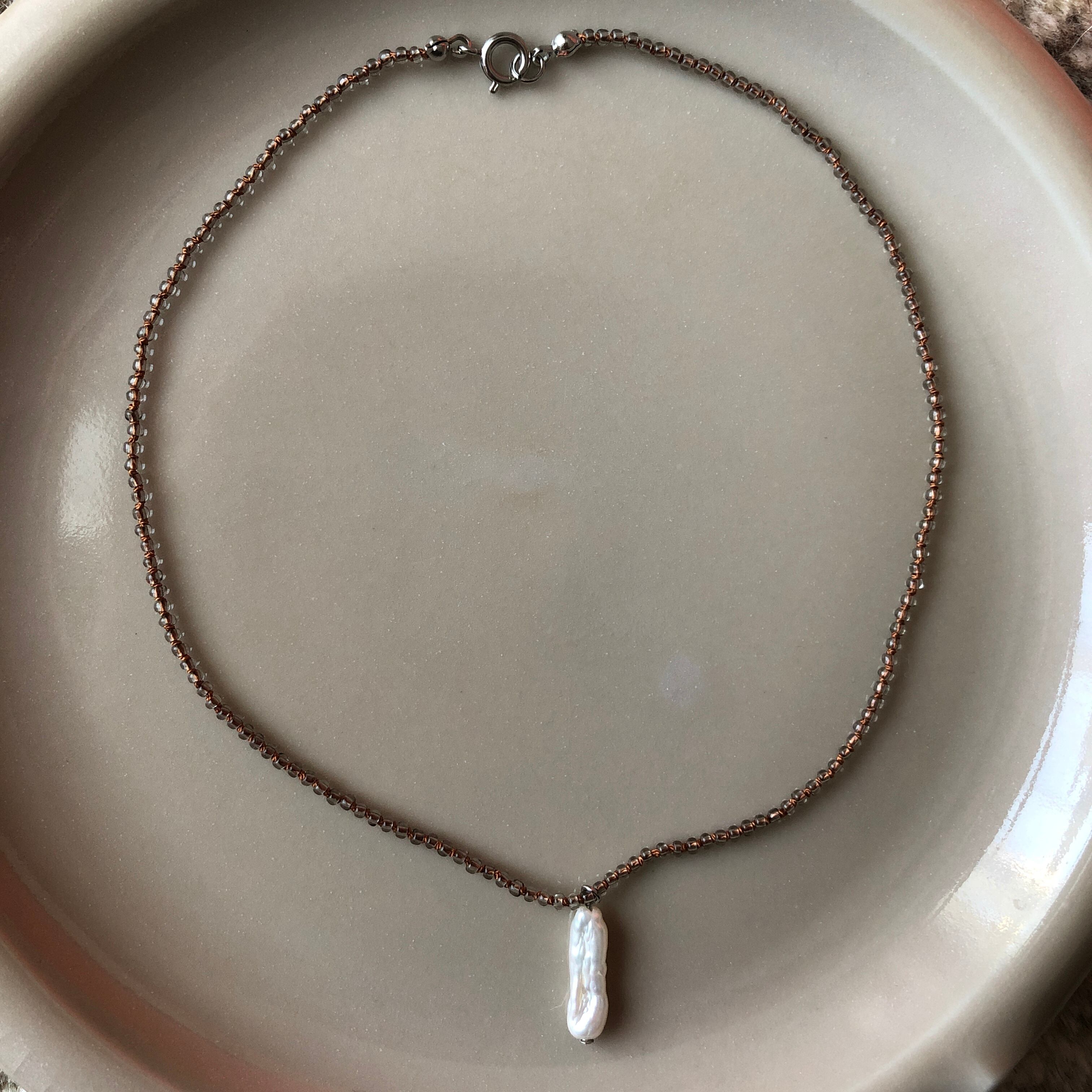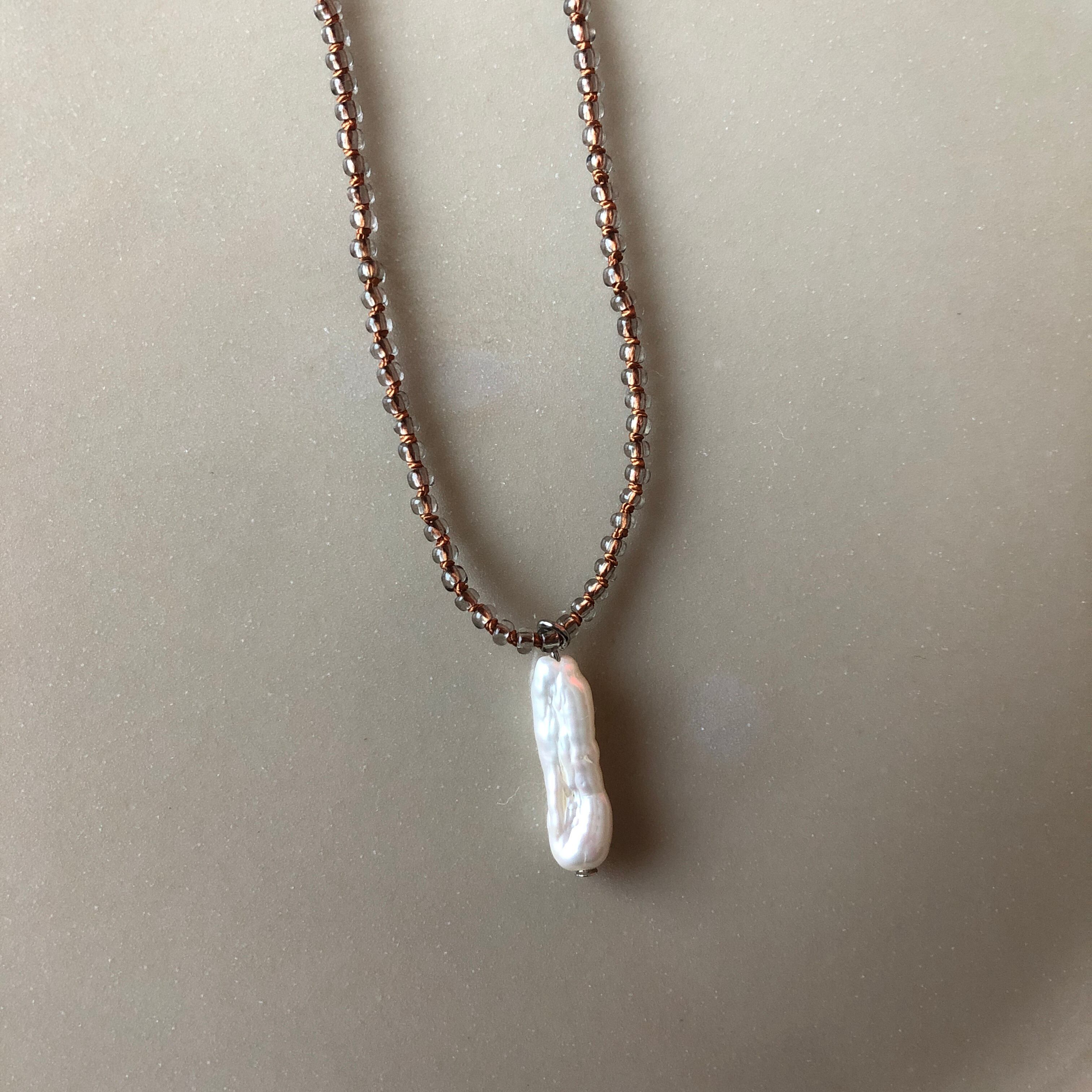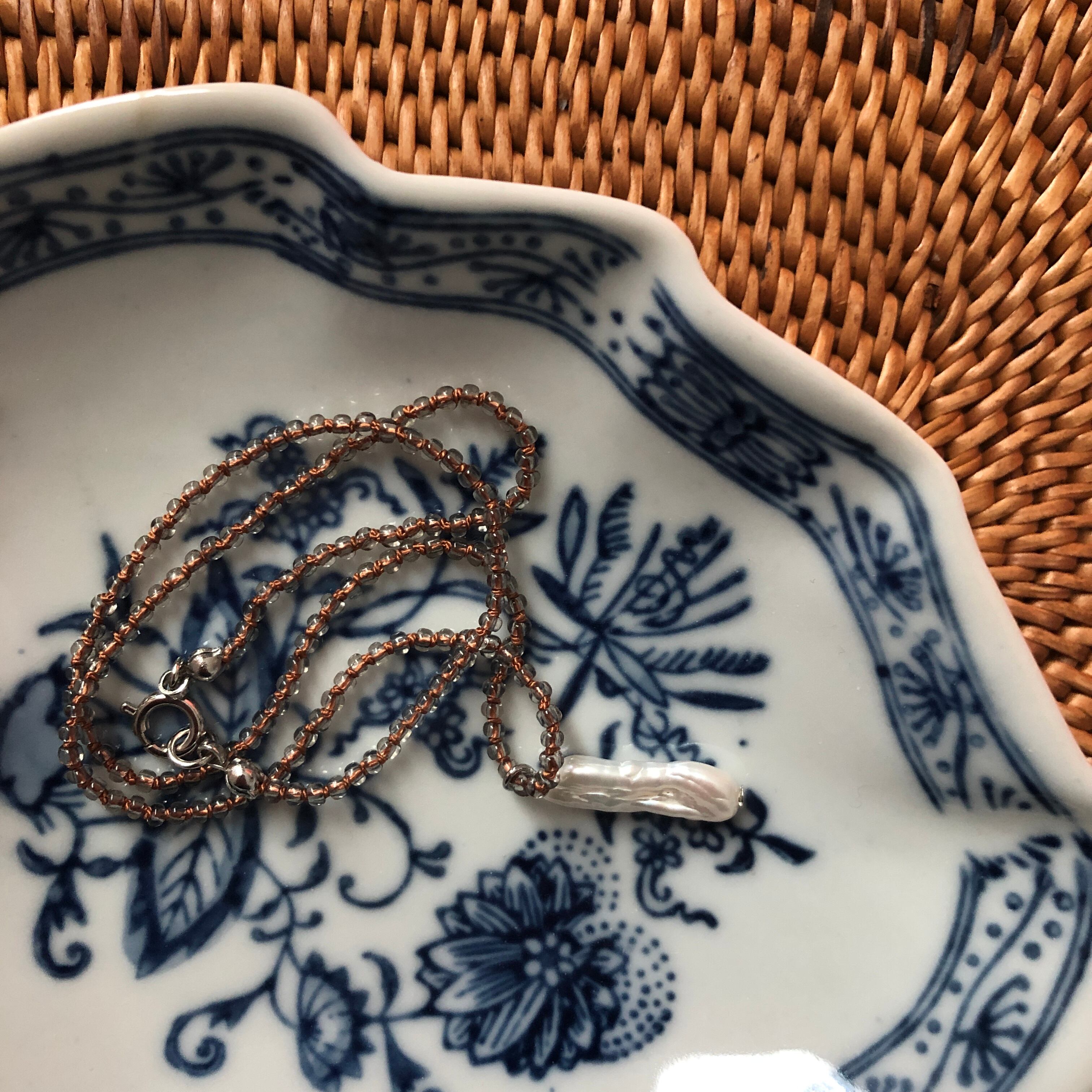 ボヘミアンガラスのシードビーズをドイツ製シルクコードでひと粒ひと粒結び留めたものにバロックパールをあしらいました。カジュアルスタイルにもドレススタイルにも着けていただけます。