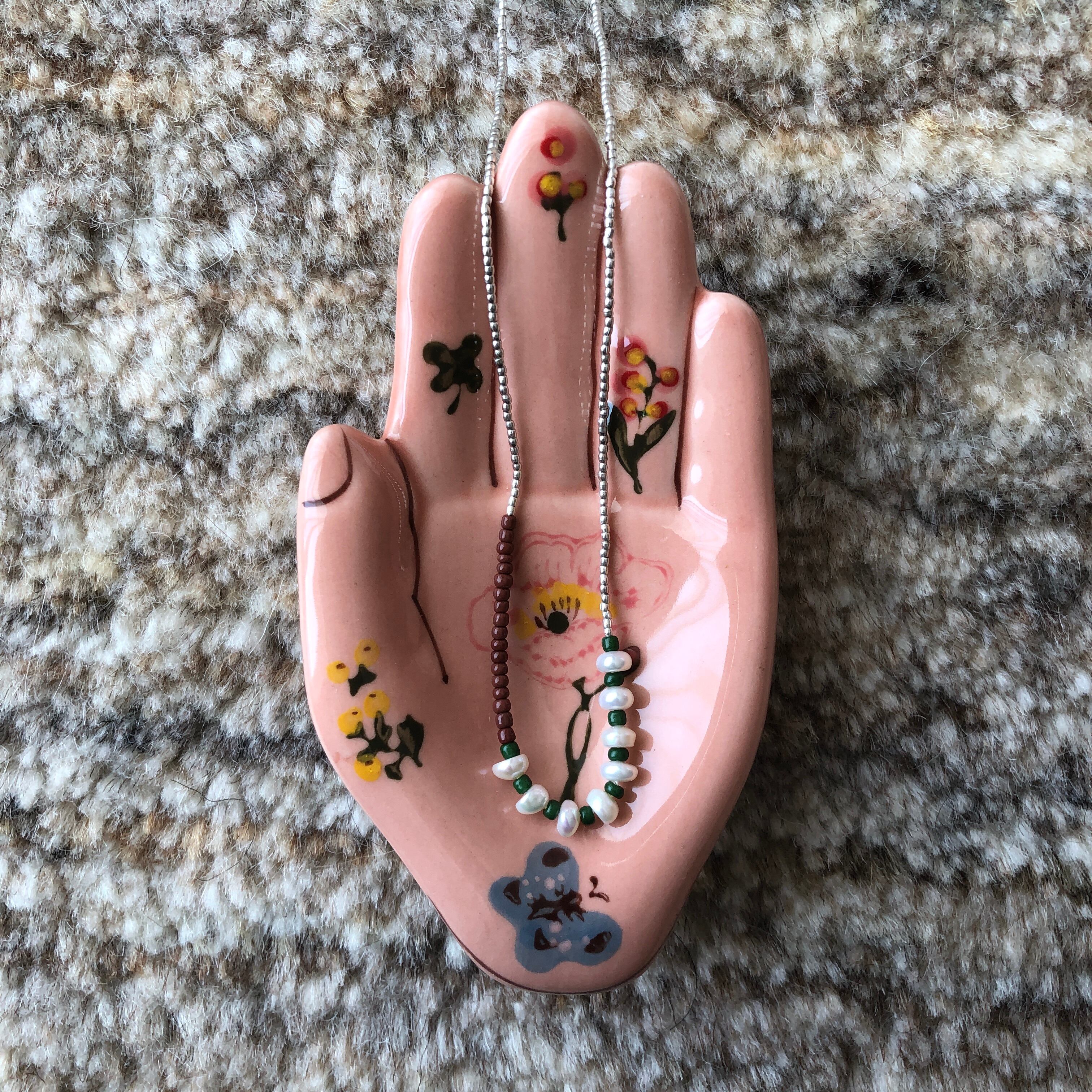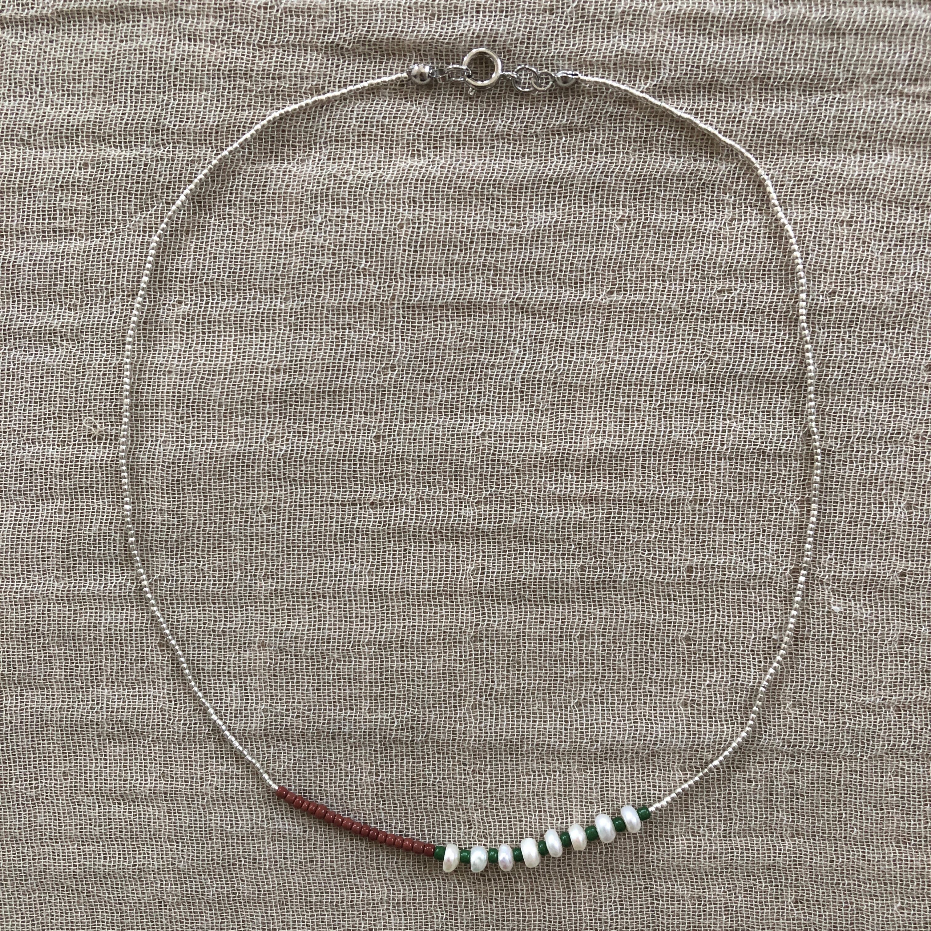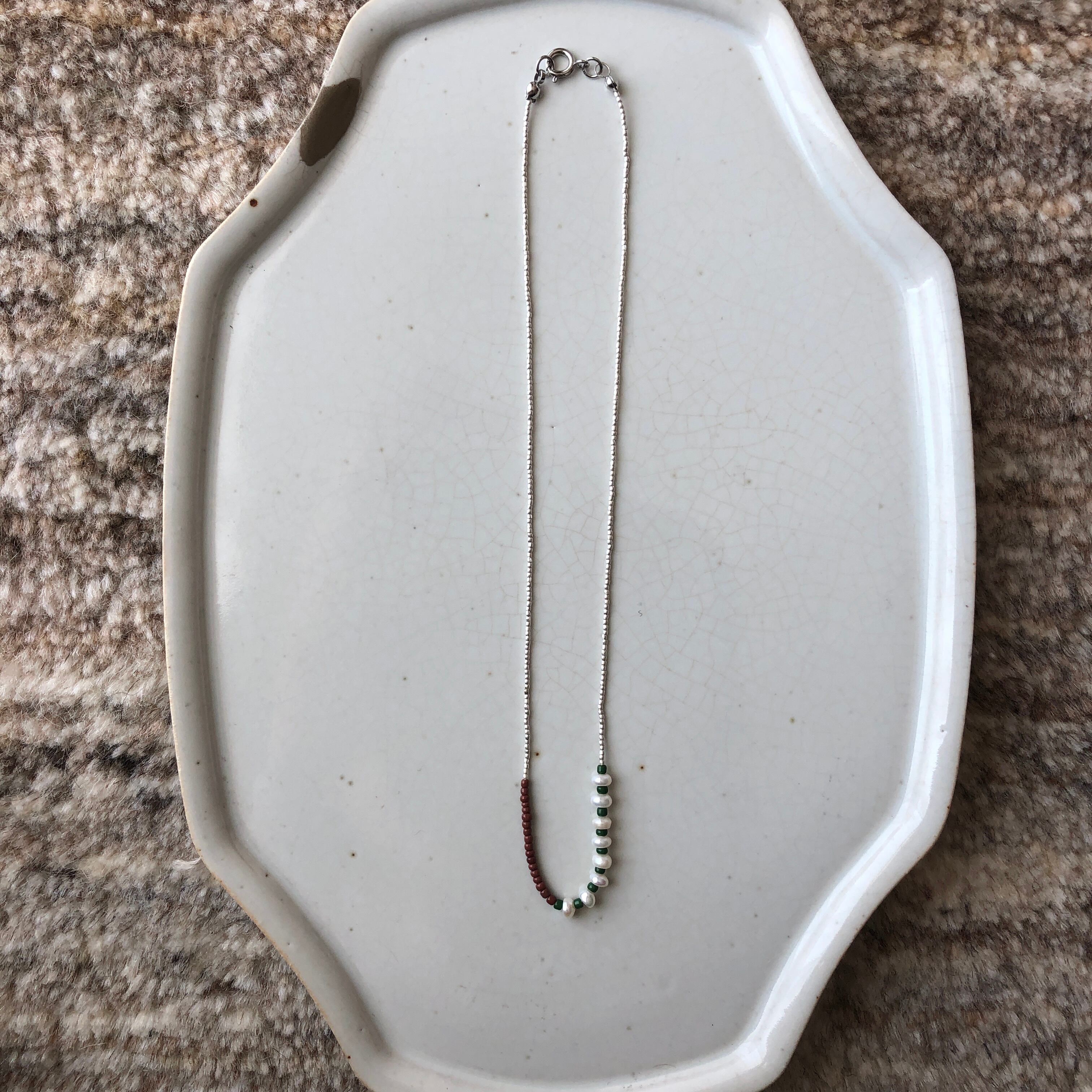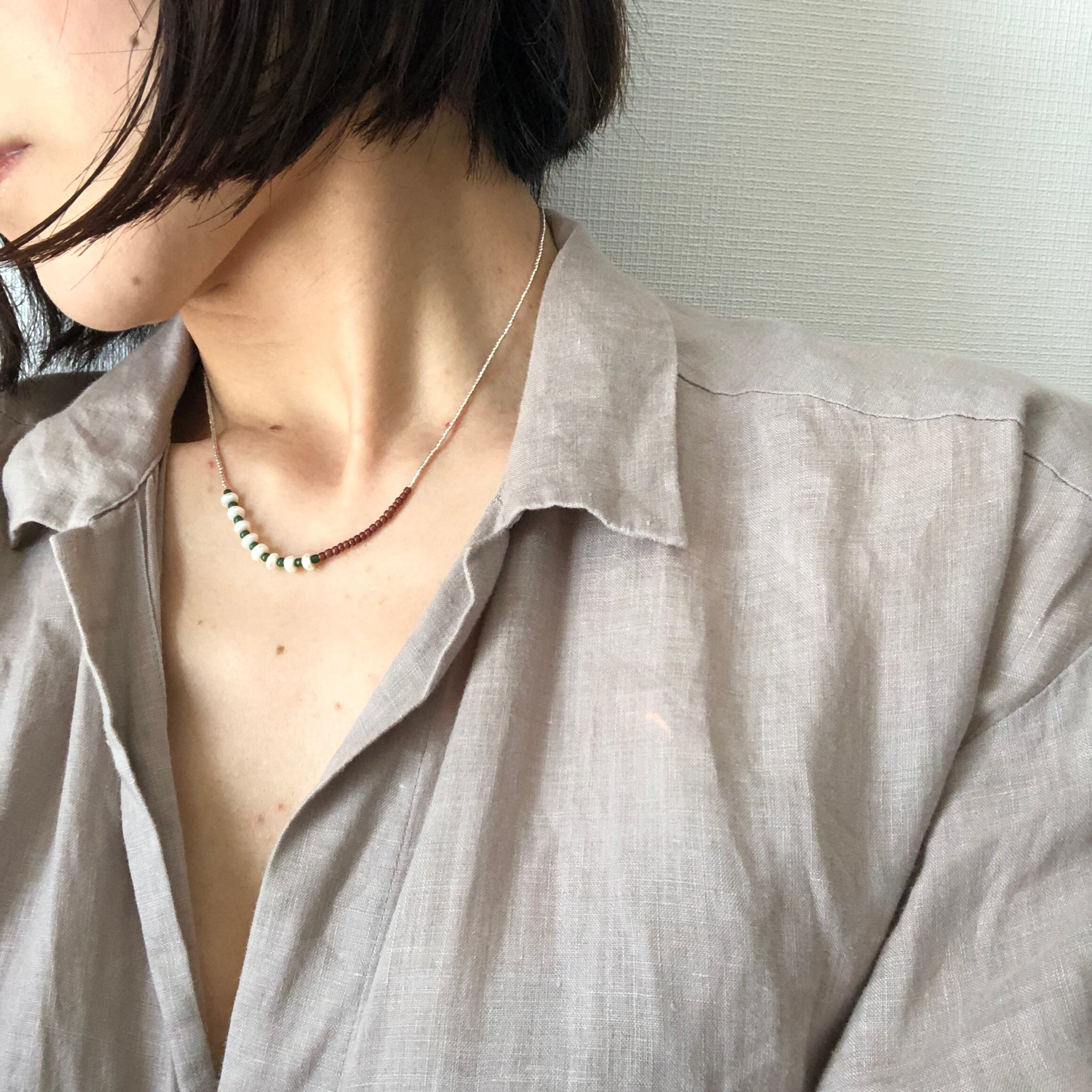 カレンシルバーの極小ビーズにブラウンのガラスビーズと淡水パールを合わせました。