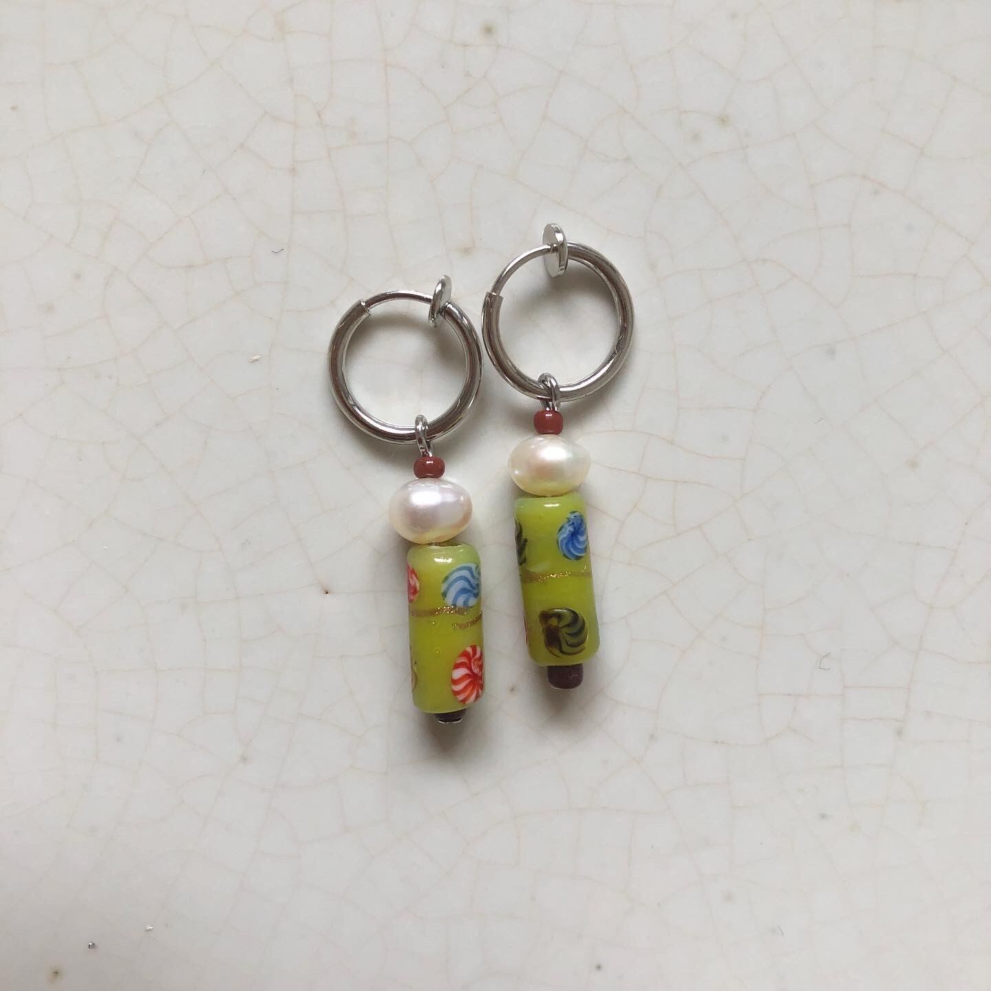material 淡水パール、ガラスシードビーズ、ガラスビーズ(インドネシア)、ロジウム(イヤリング金具)