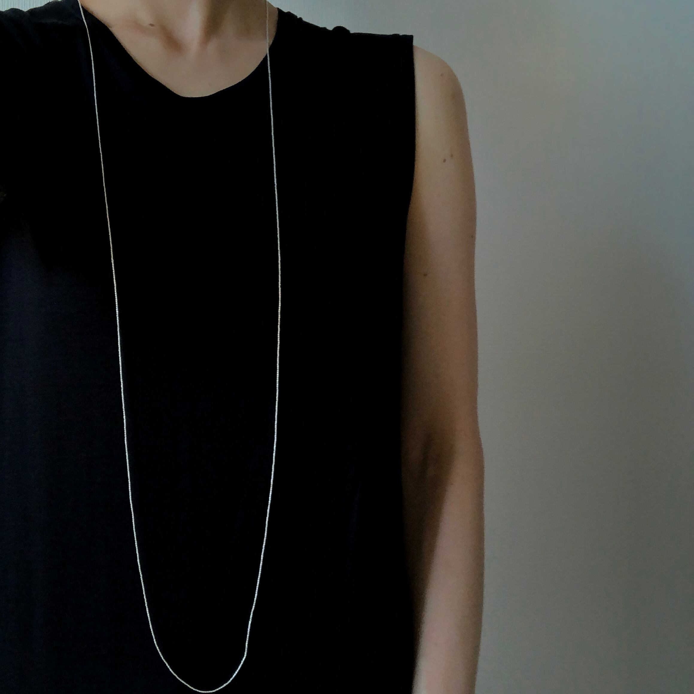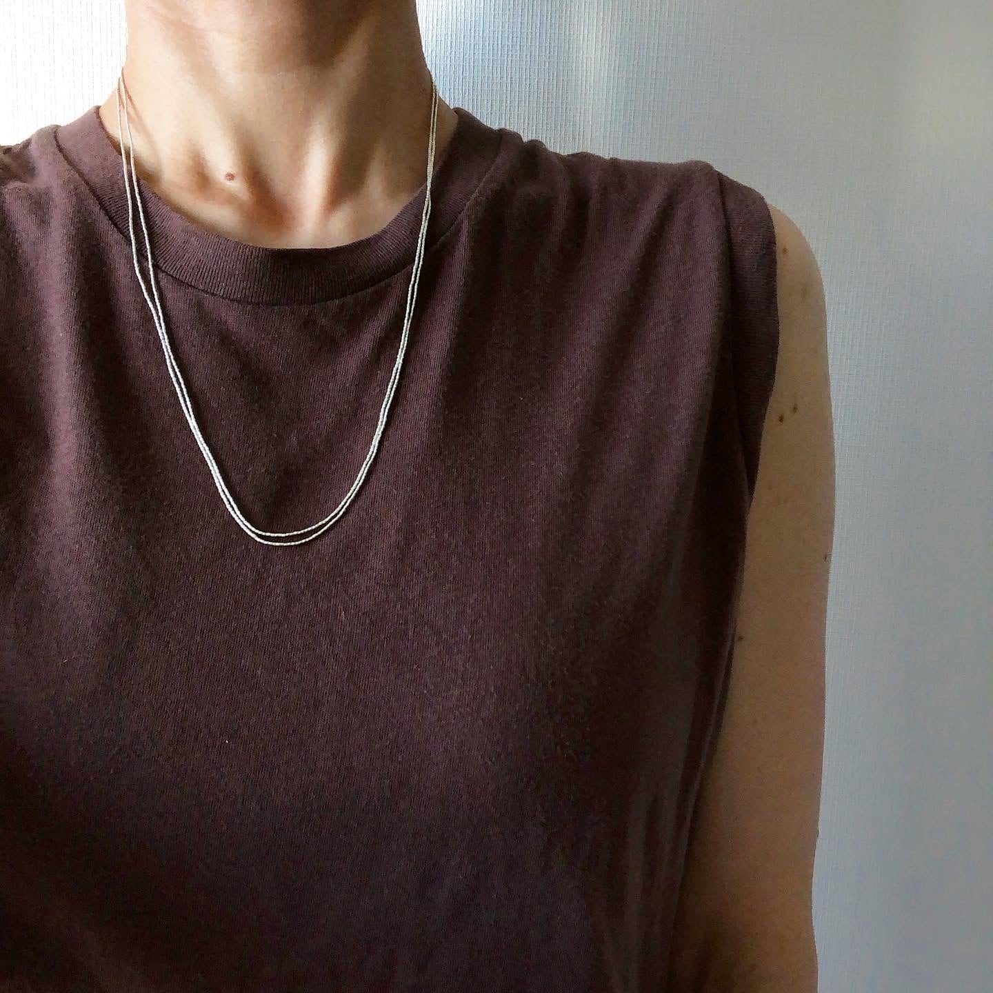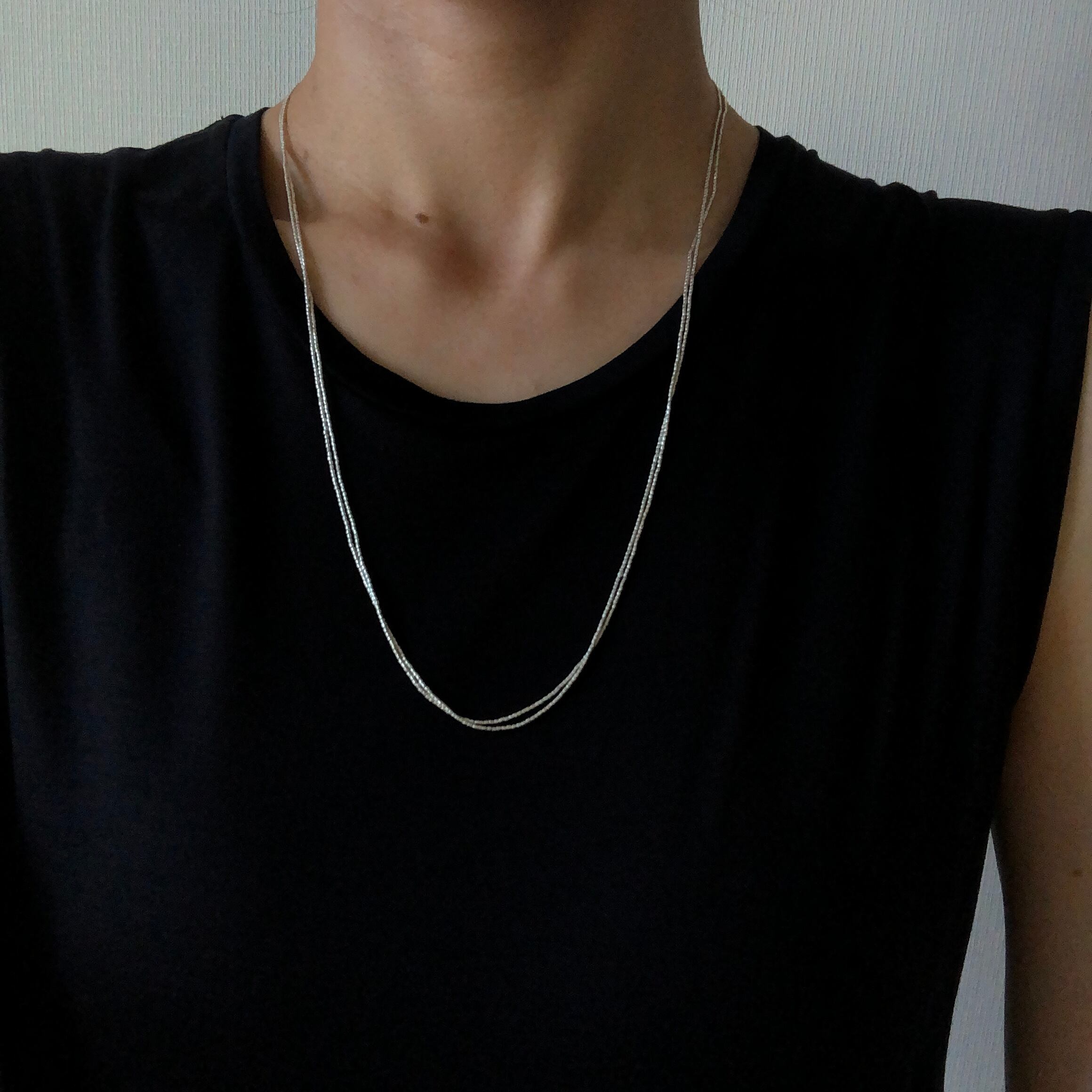 ビーズがかなり小さいので、シルバーのチェーンネックレスのようにも見えます。