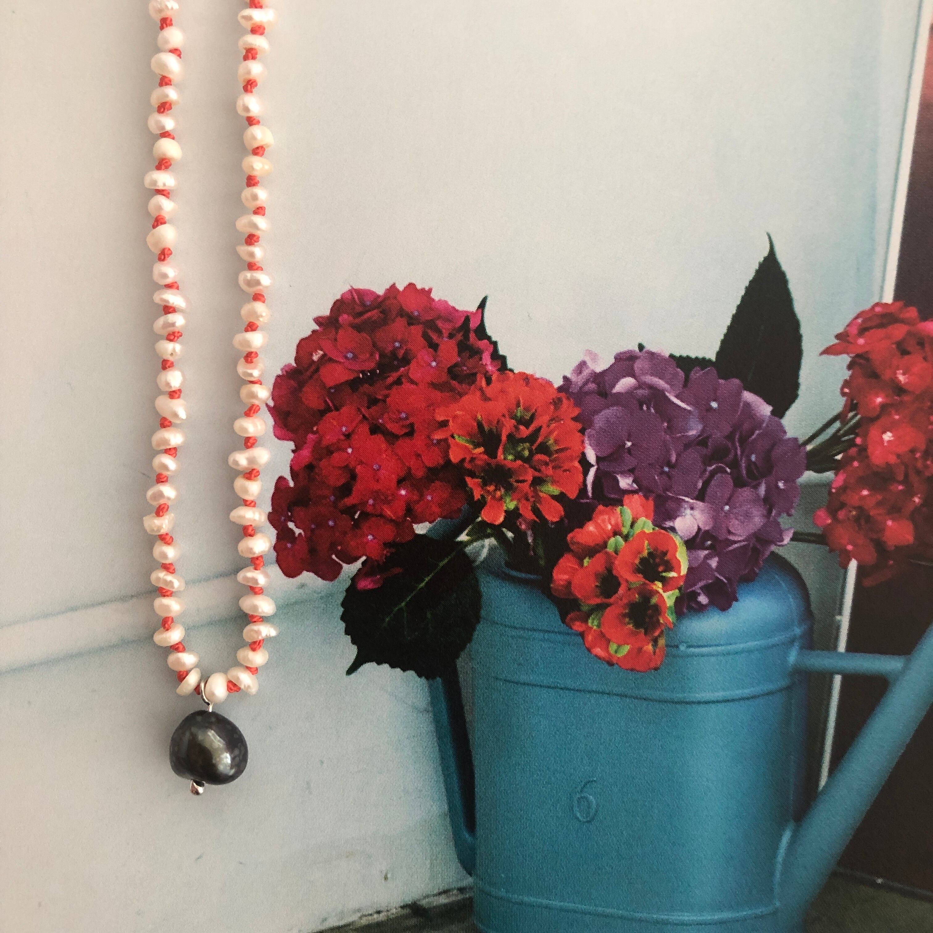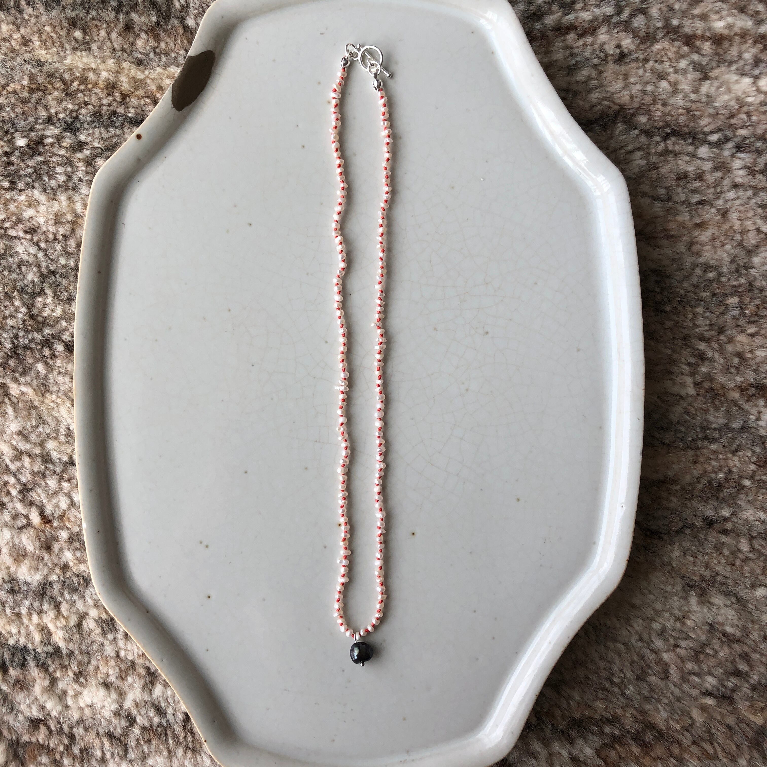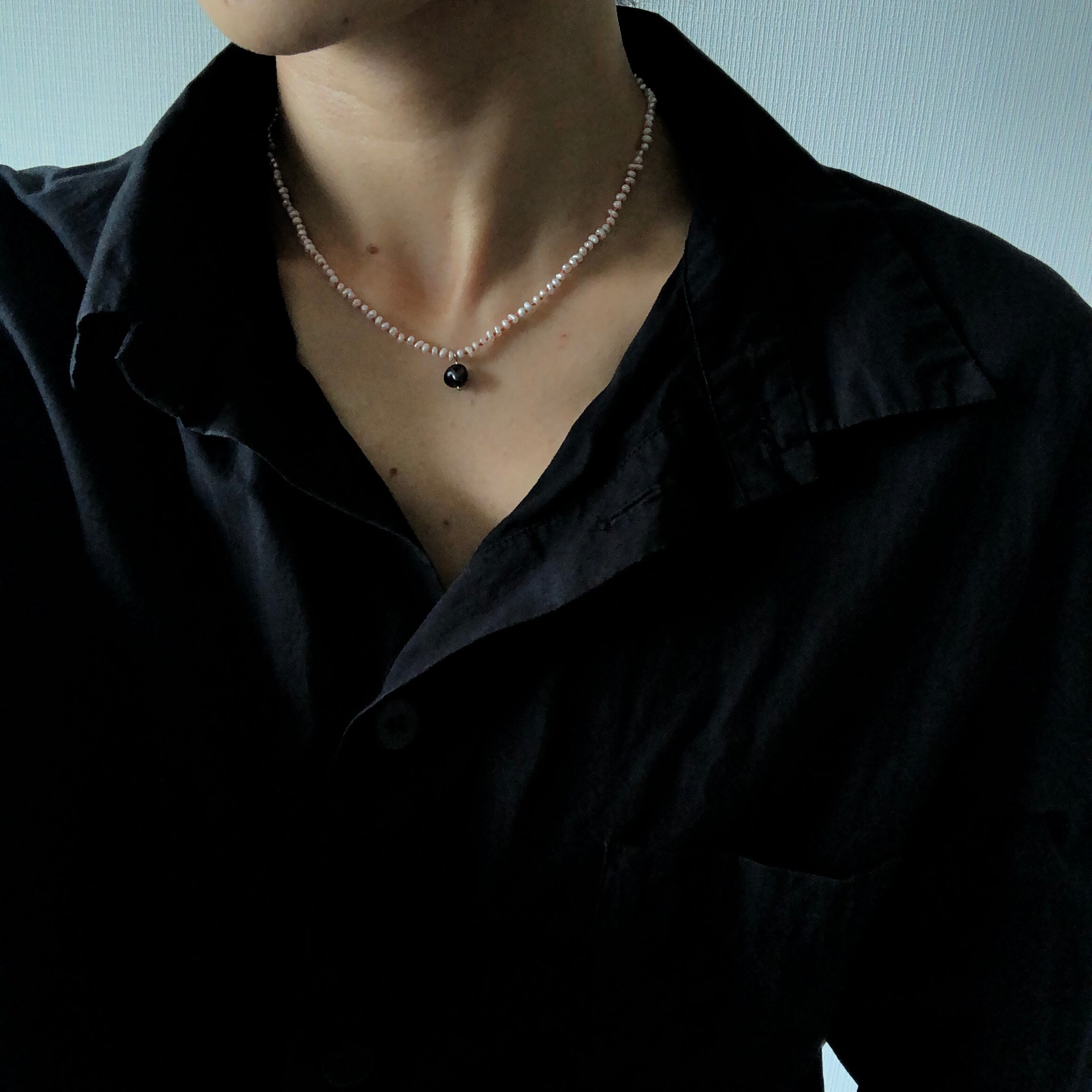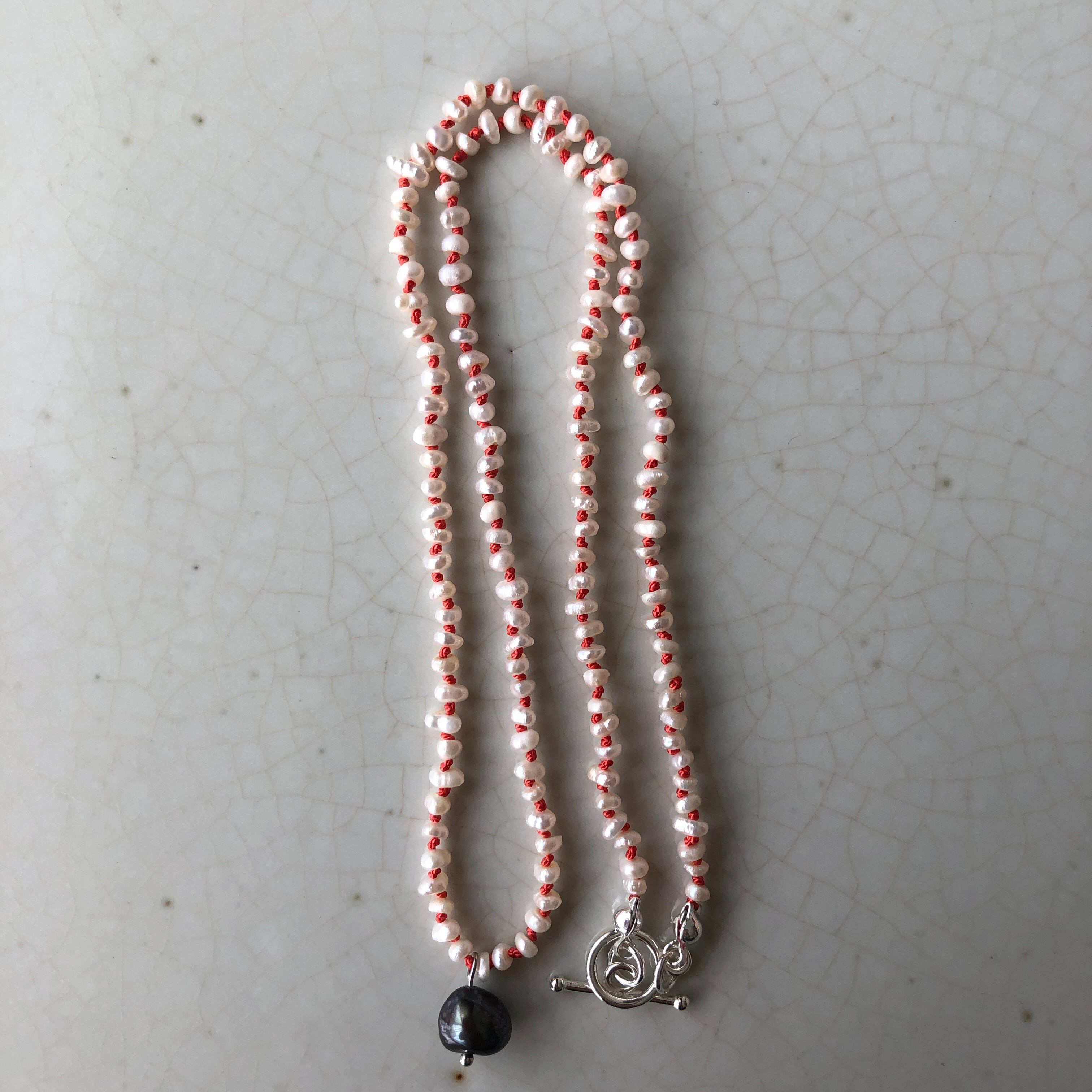 極小のケシパールをシルクコードでひと粒ひと粒結んだネックレスです。