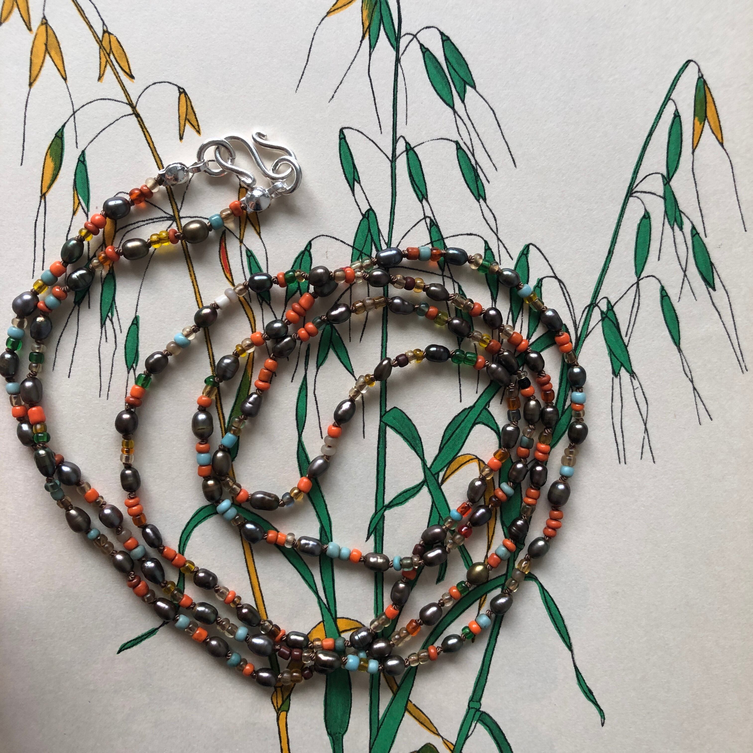 グレーの小粒淡水パールとインポートのガラスシードビーズを使ってカジュアルなロングネックレスを作りました。