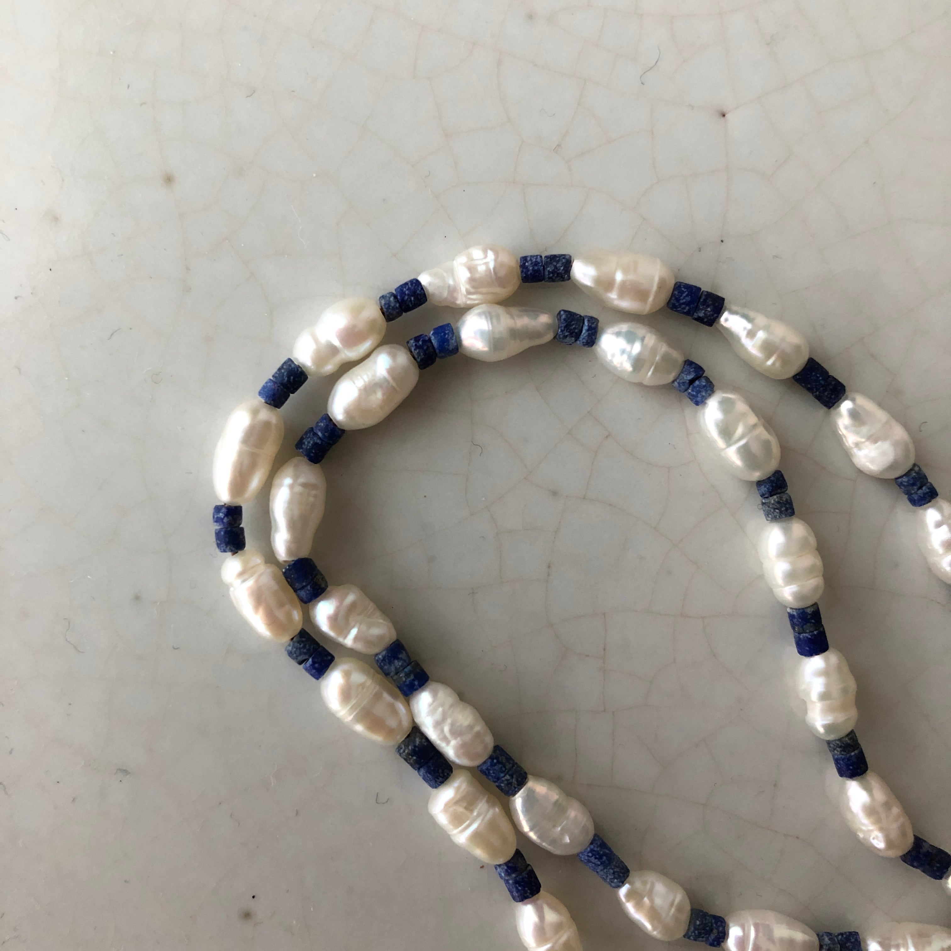 淡水パールと天然石ラピスラズリのビーズを組み合わせて作りました。