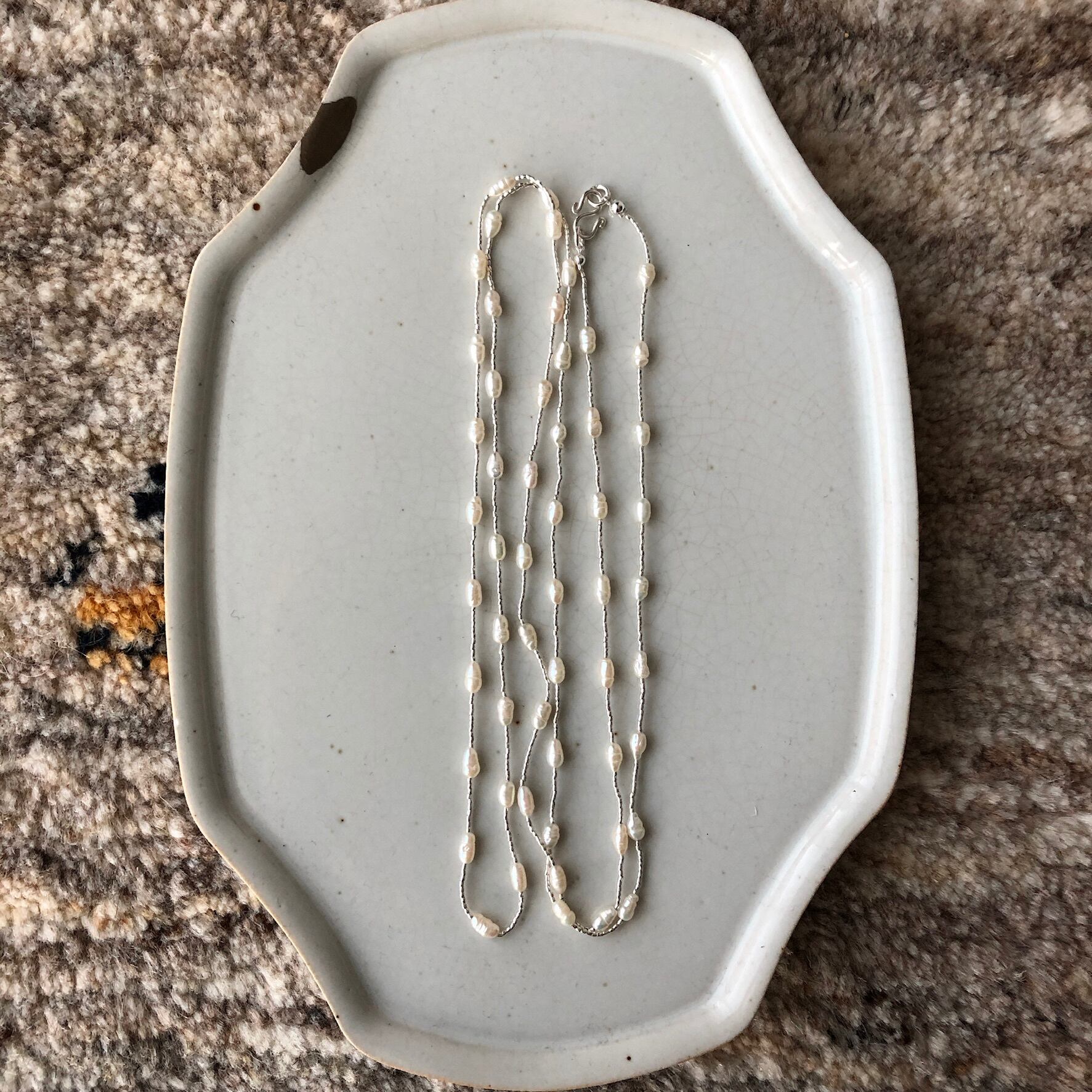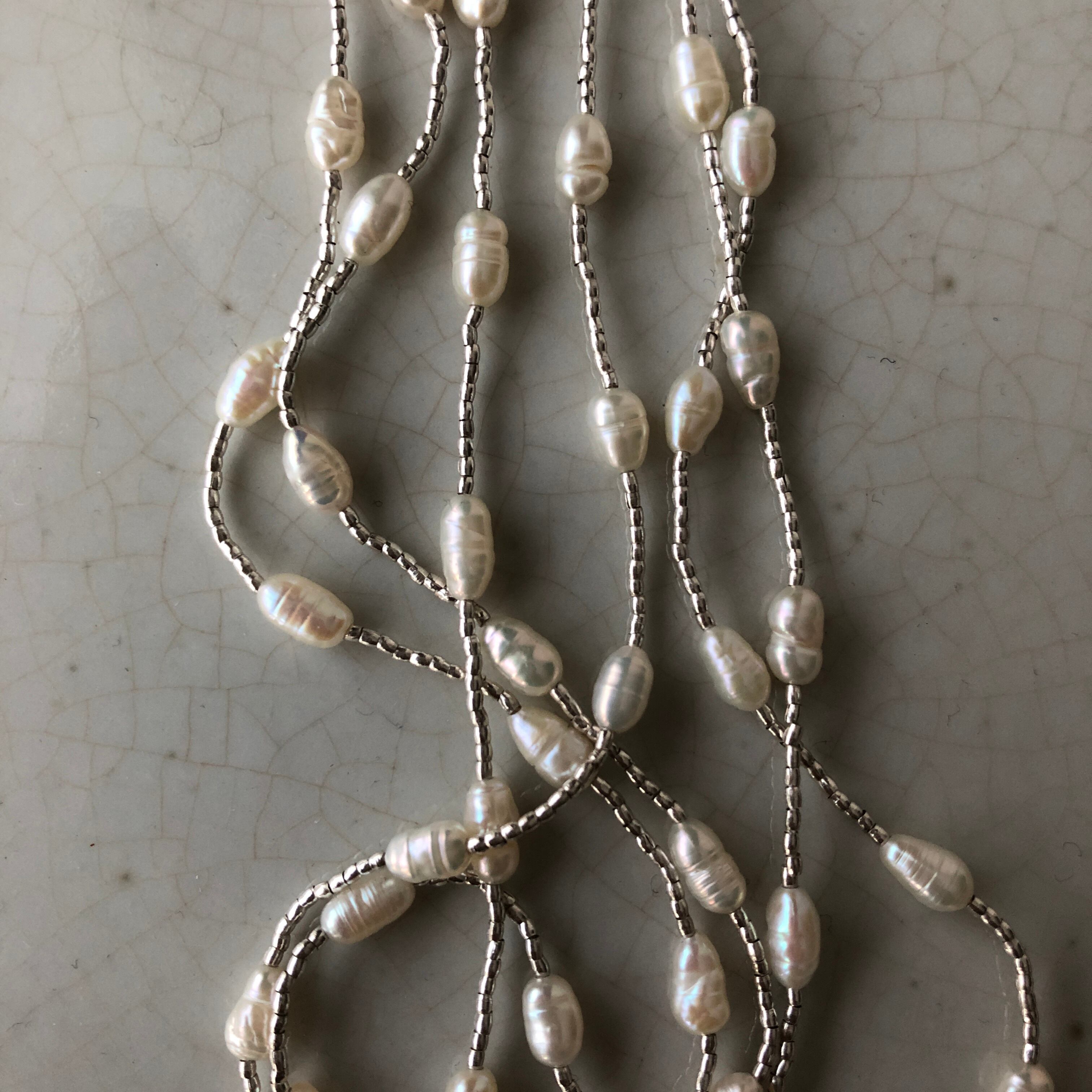 不均一で繊細な輝きのカレンシルバーと淡水パールの組み合わせは、儚げな印象と芯の強さを持ち合わせているように感じます。