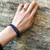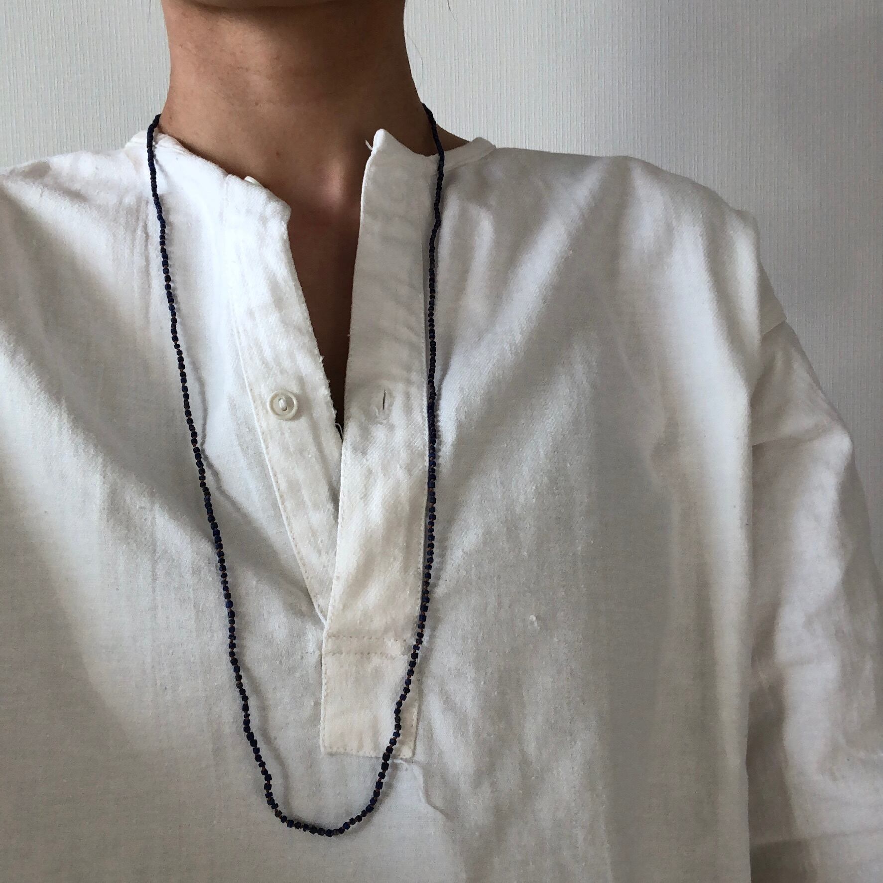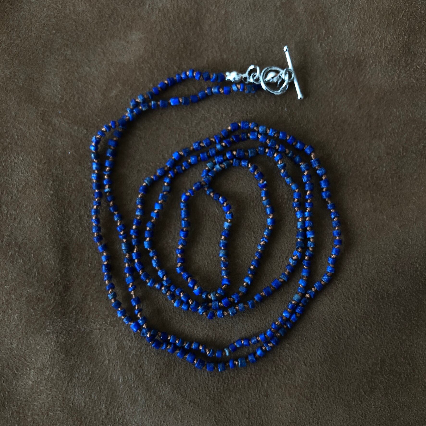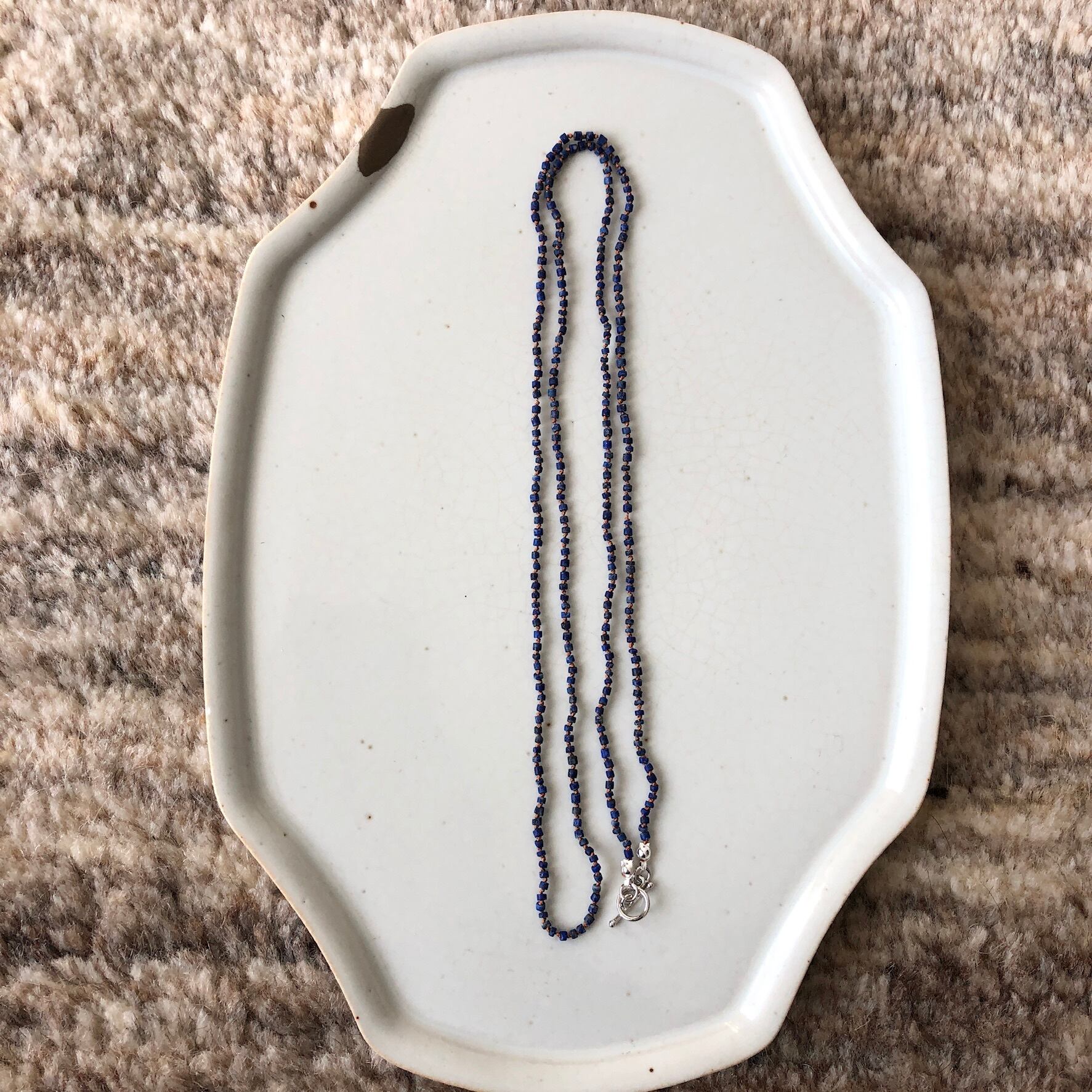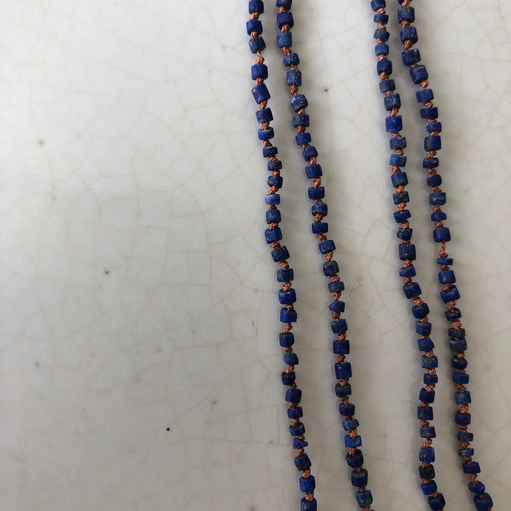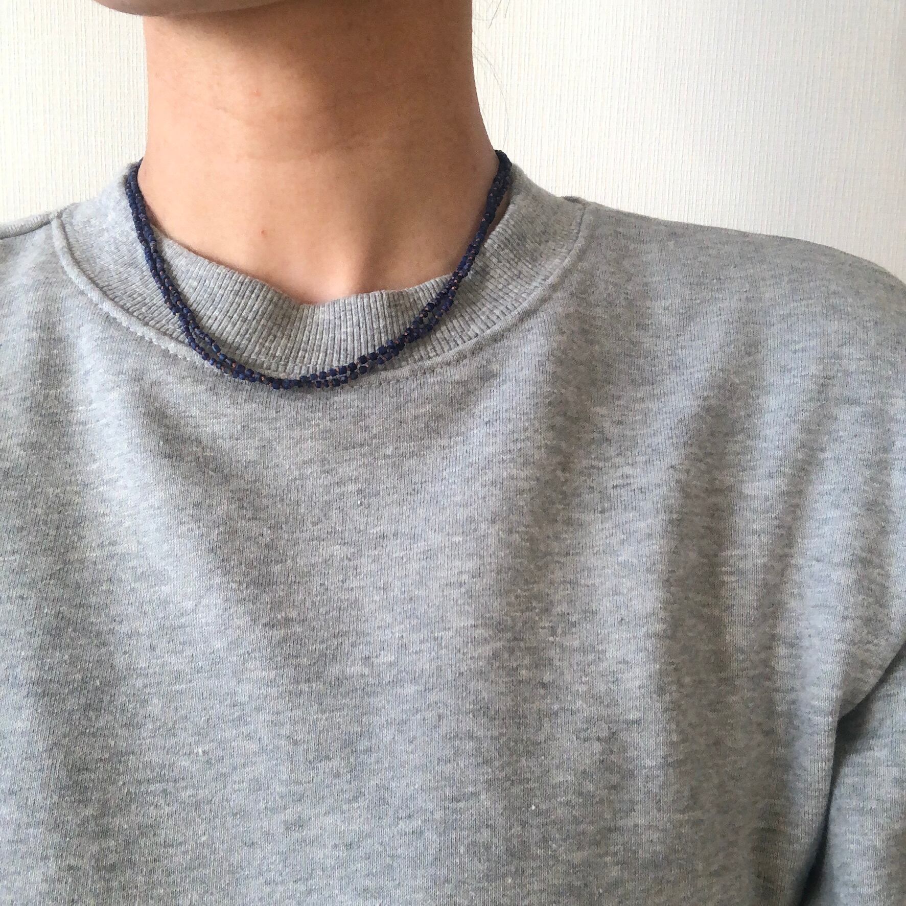 今回は、小粒のラピスラズリをシルクコードでひと粒ひと粒結び留め、アクセサリーに仕上げました。