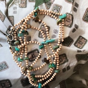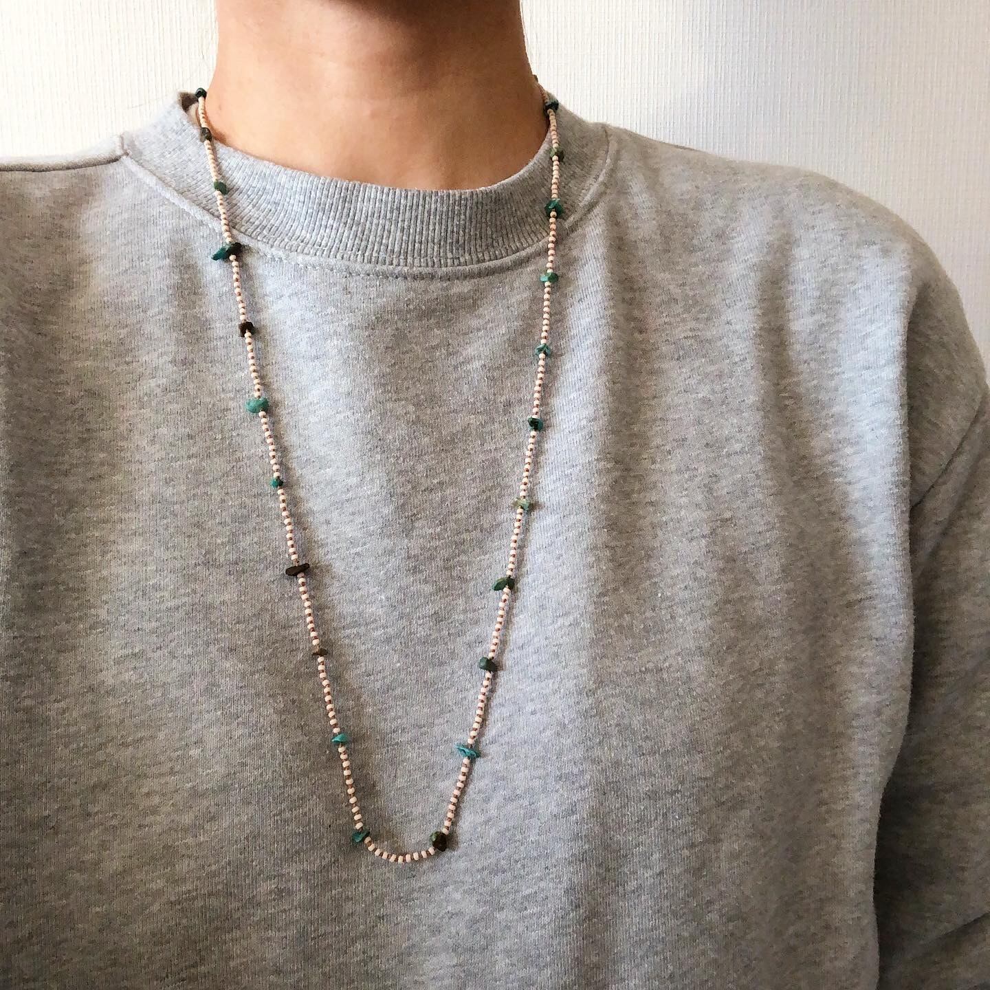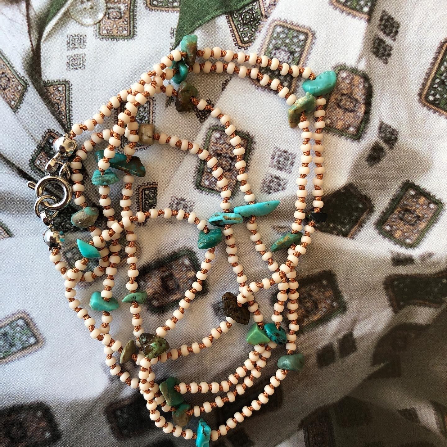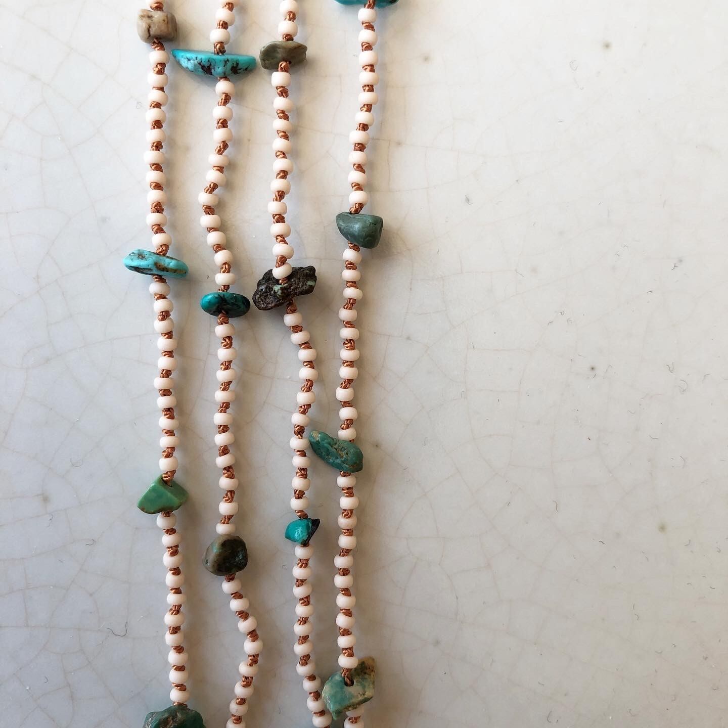 象牙色のマットなシードビーズとターコイズの細石をドイツ製のシルクコードで繋ぎました。