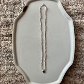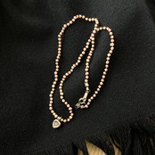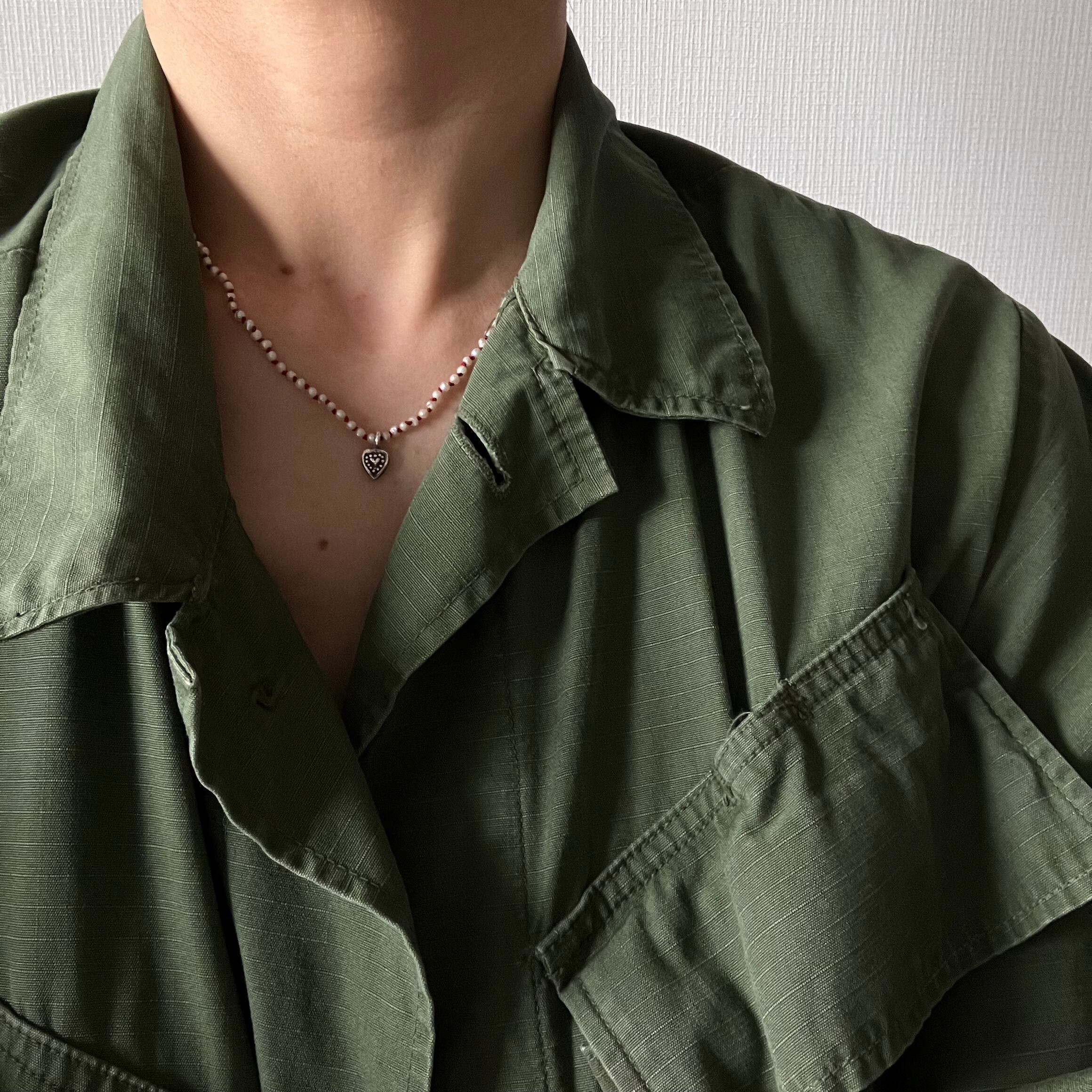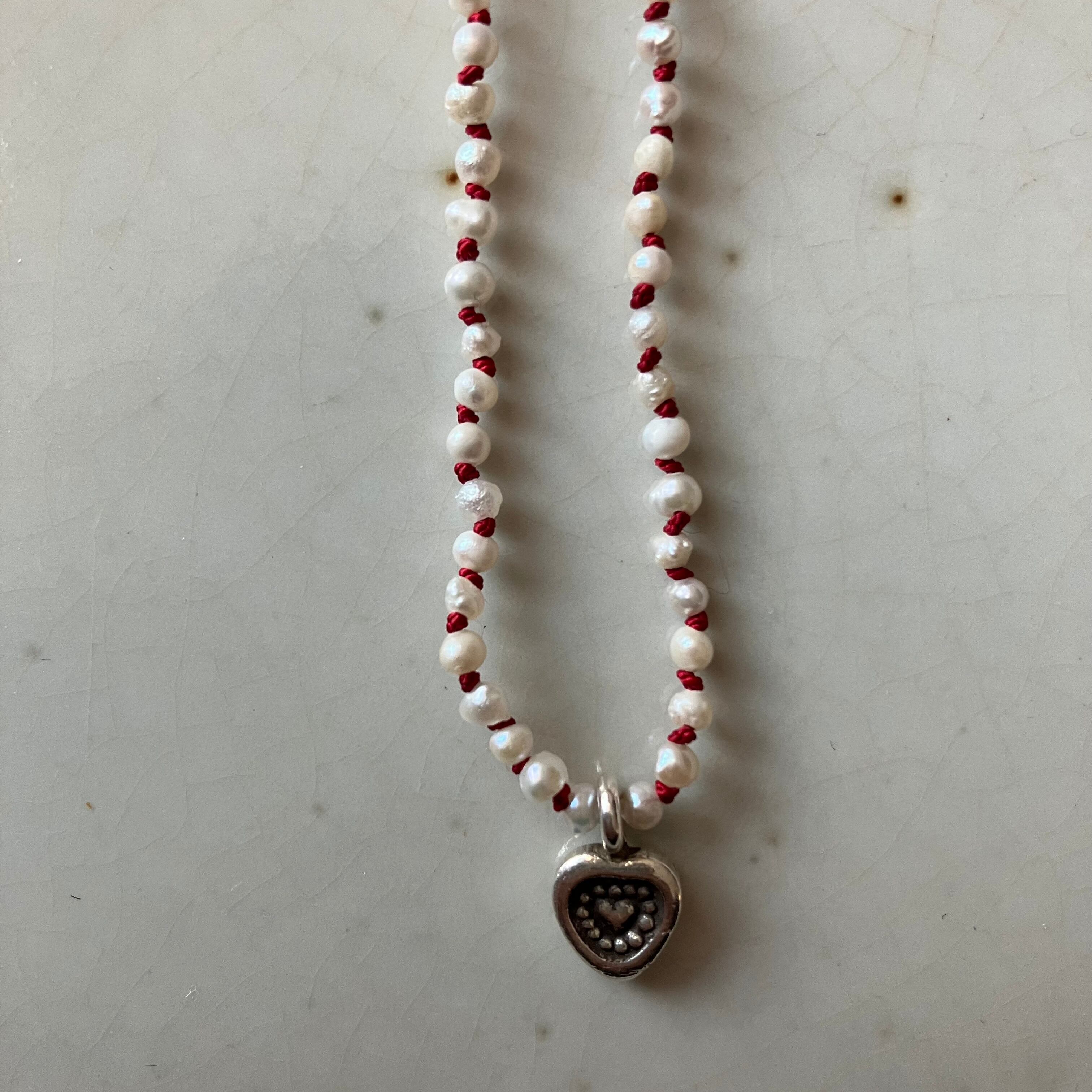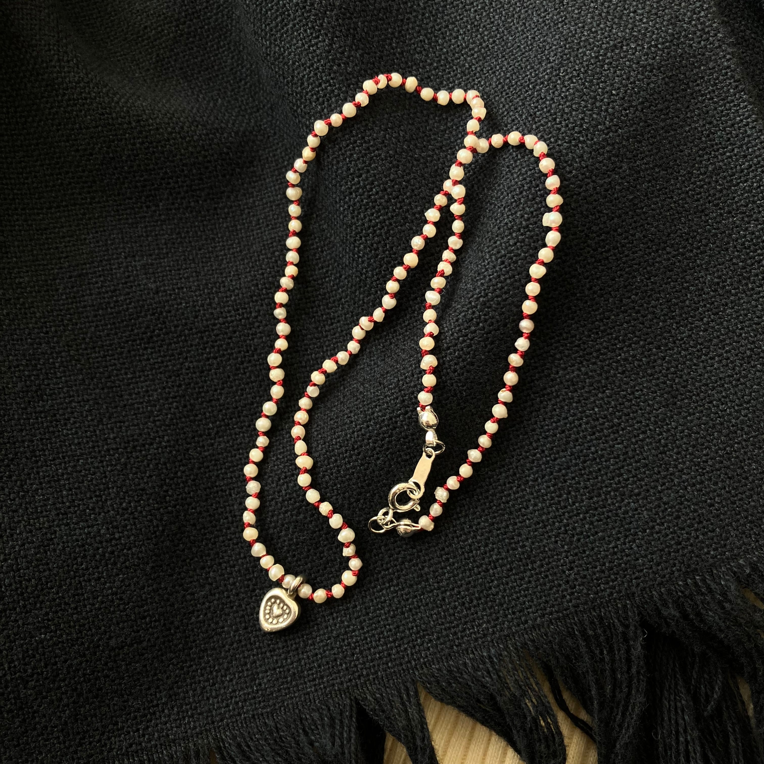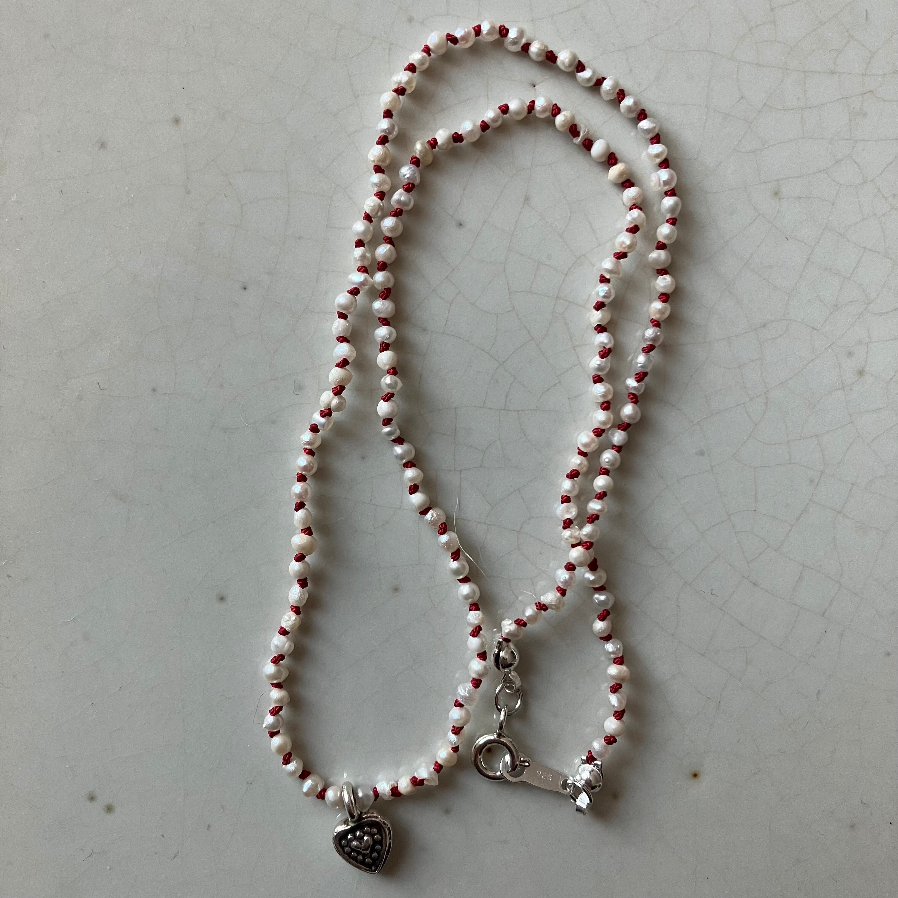 マットな質感の入り混じった小粒ケシパールをシルクコードでひと粒ひと粒結び留め、トップにはカレンシルバーで作られた小さなハートモチーフをあしらいました。