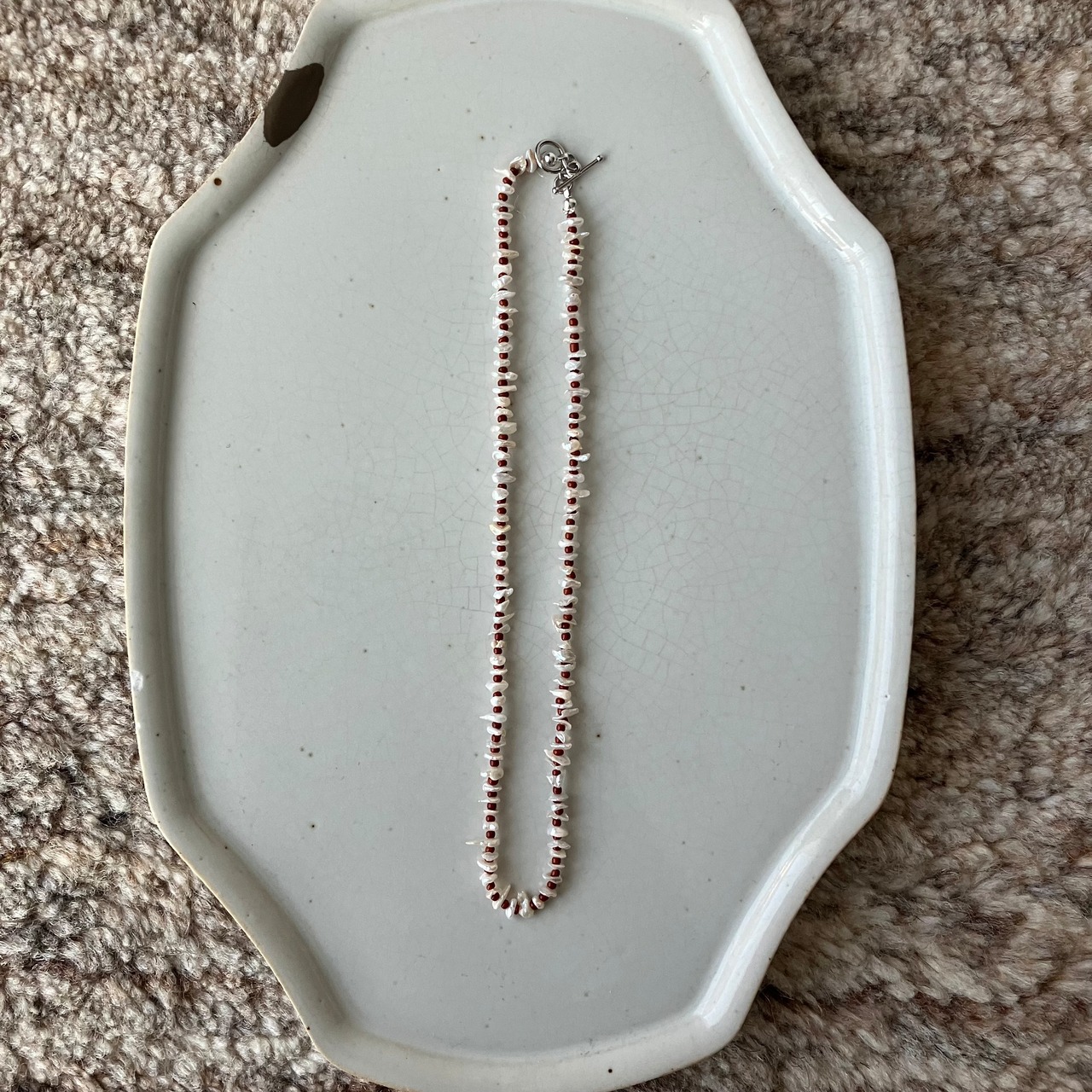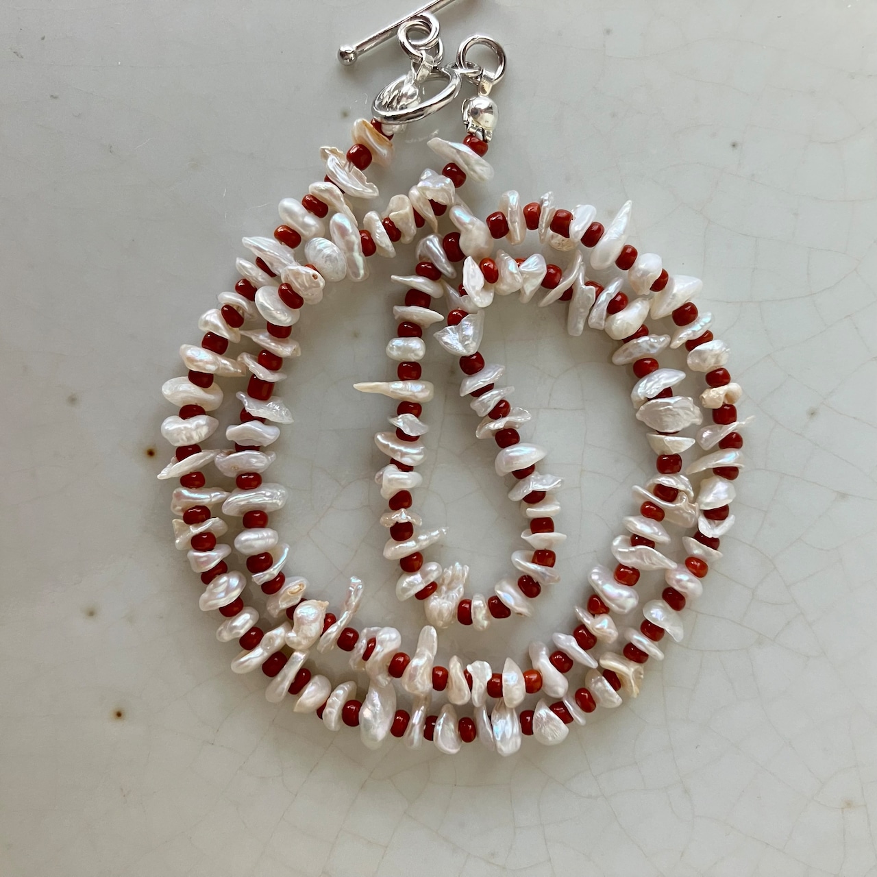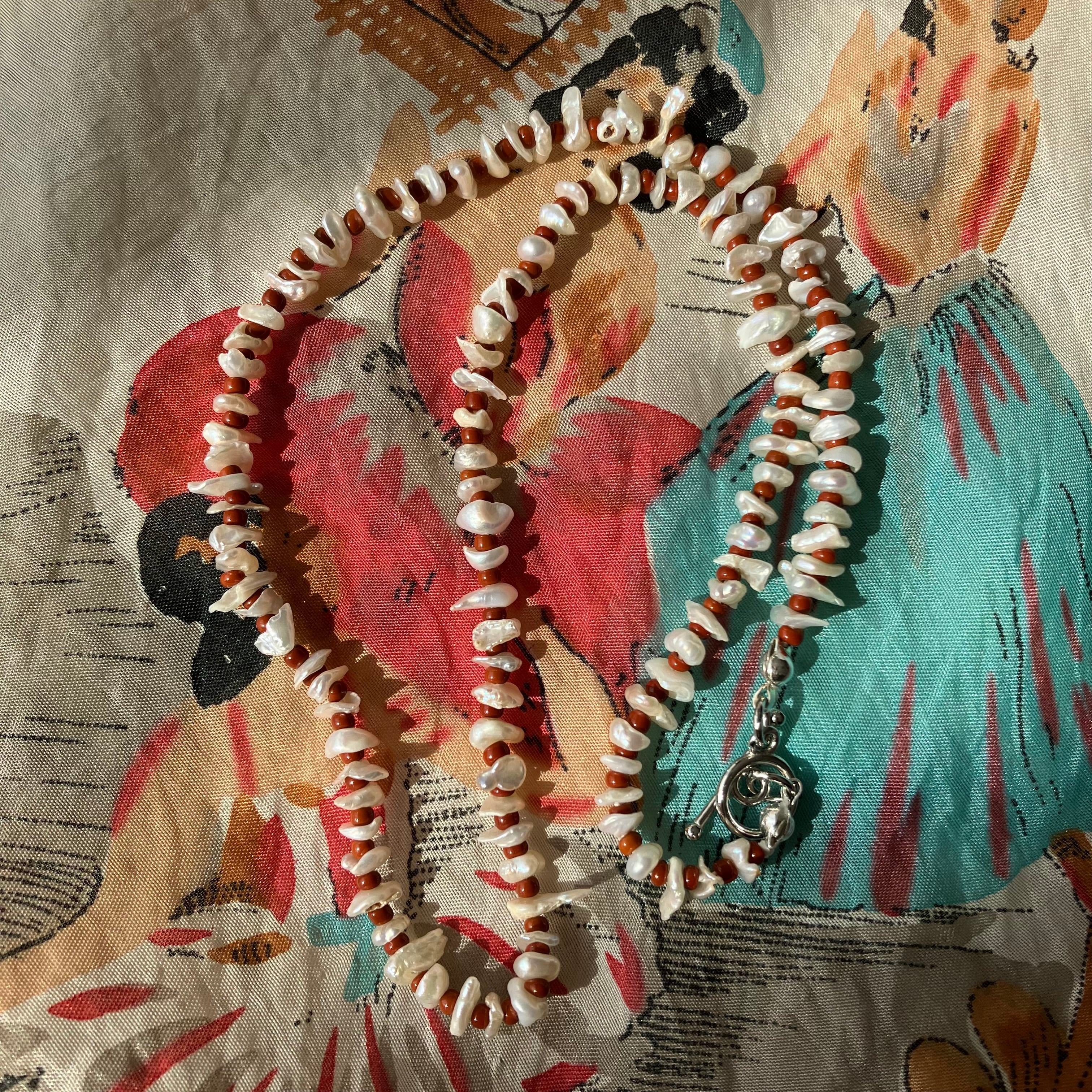 いびつな形のケシパールとフランスのヴィンテージシードビーズを組み合わせました。
